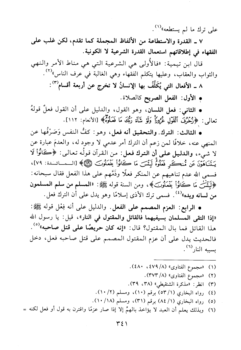 7- القدرة والاستطاعة من الألفاظ المجملة كما تقدم، لكن غلب على الفقهاء في إطلاقاتهم استعمال القدرة الشرعية لا الكونية.