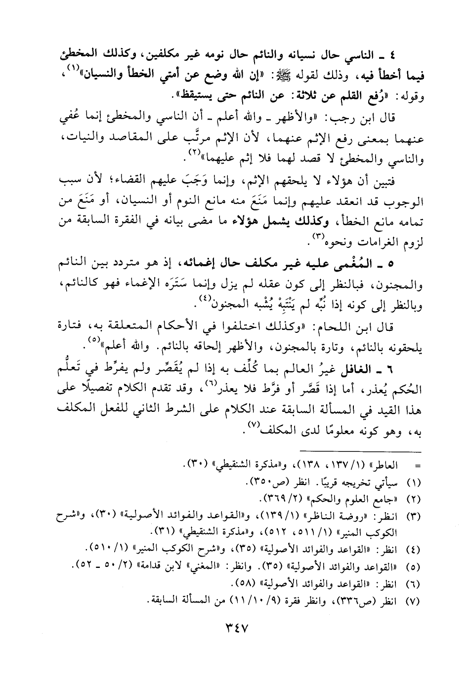 4- الناسي حال نسيانه والنائم حال نومه غير مكلفين، وكذلك المخطئ فيما أخطأ فيه، وذلك لقوله - صلى الله عليه وسلم -: «إن الله وضع عن أمتي الخطأ والنسيان» (1) ، وقوله: «رُفع القلم عن ثلاثة: عن النائم حتى يستيقظ» .