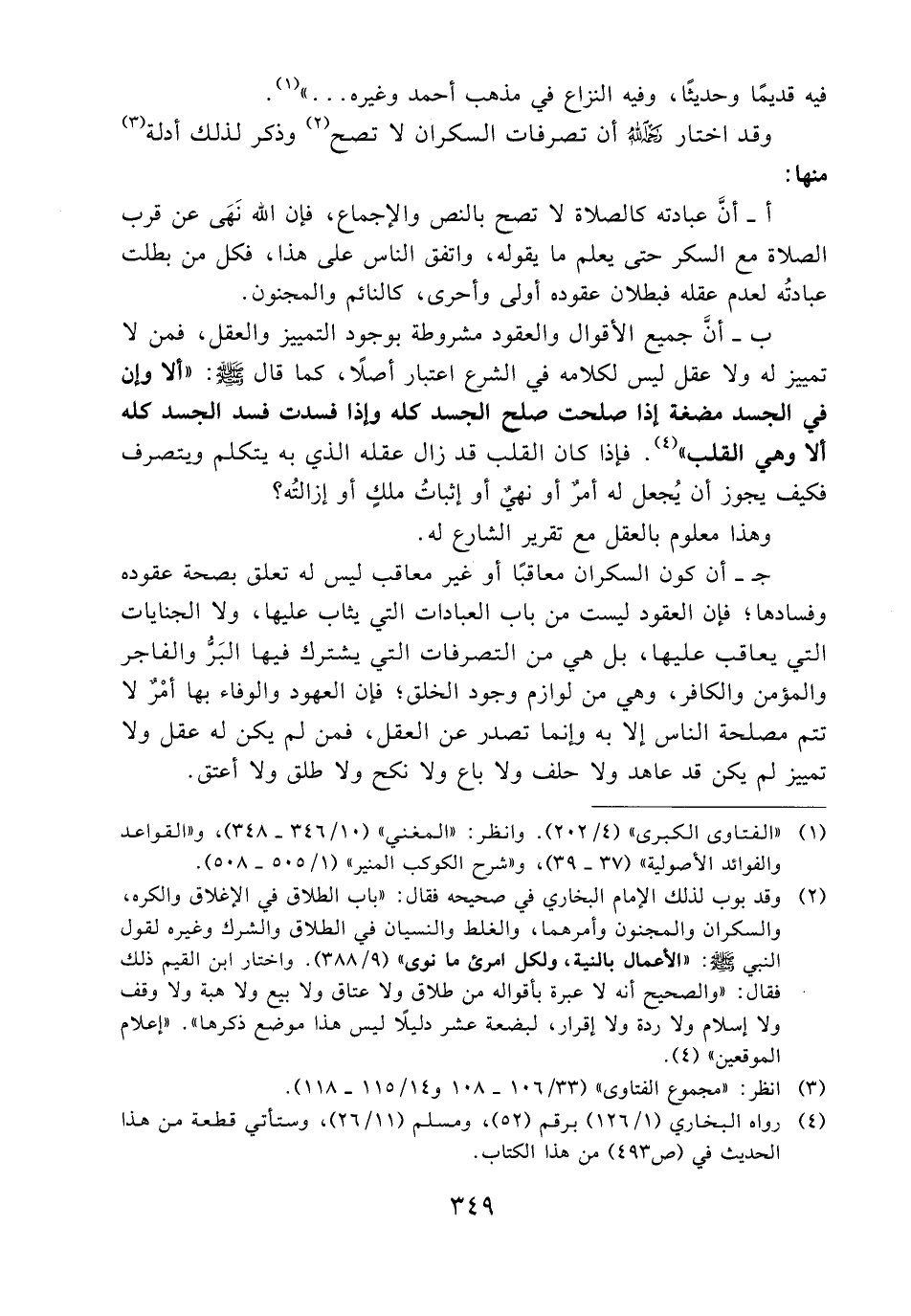 ب- أن جميع الأقوال والعقود مشروطة بوجود التمييز والعقل، فمن لا تمييز له ولا عقل ليس لكلامه في الشارع اعتبار أصلاً، كما قال - صلى الله عليه وسلم -: «ألا وإن في الجسد مضغة إذا صلحت صلح الجسد كله وإذا فسدت فسد الجسد كله ألا وهي القلب» (4) . فإذا كان القلب قد زال عقله الذي به يتكلم ويتصرف فكيف يجوز أن يجعل له أمر أو نهي أو إثبات ملك أو إزالته؟