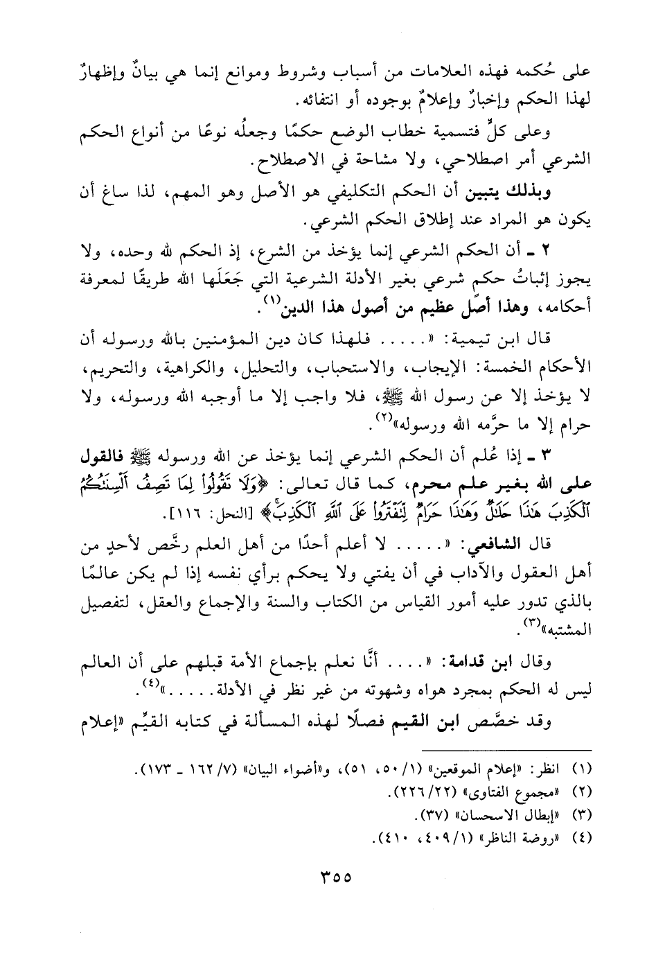 3- إذا علم أن الحكم الشرعي إنما يؤخذ عن الله ورسوله - صلى الله عليه وسلم - فالقول على الله بغير علم محرم، كما قال تعالى: {وَلا تَقُولُوا لِمَا تَصِفُ أَلْسِنَتُكُمُ الْكَذِبَ هَذَا حَلالٌ وَهَذَا حَرَامٌ لِتَفْتَرُوا عَلَى اللهِ الْكَذِبَ} [النحل: 116] .