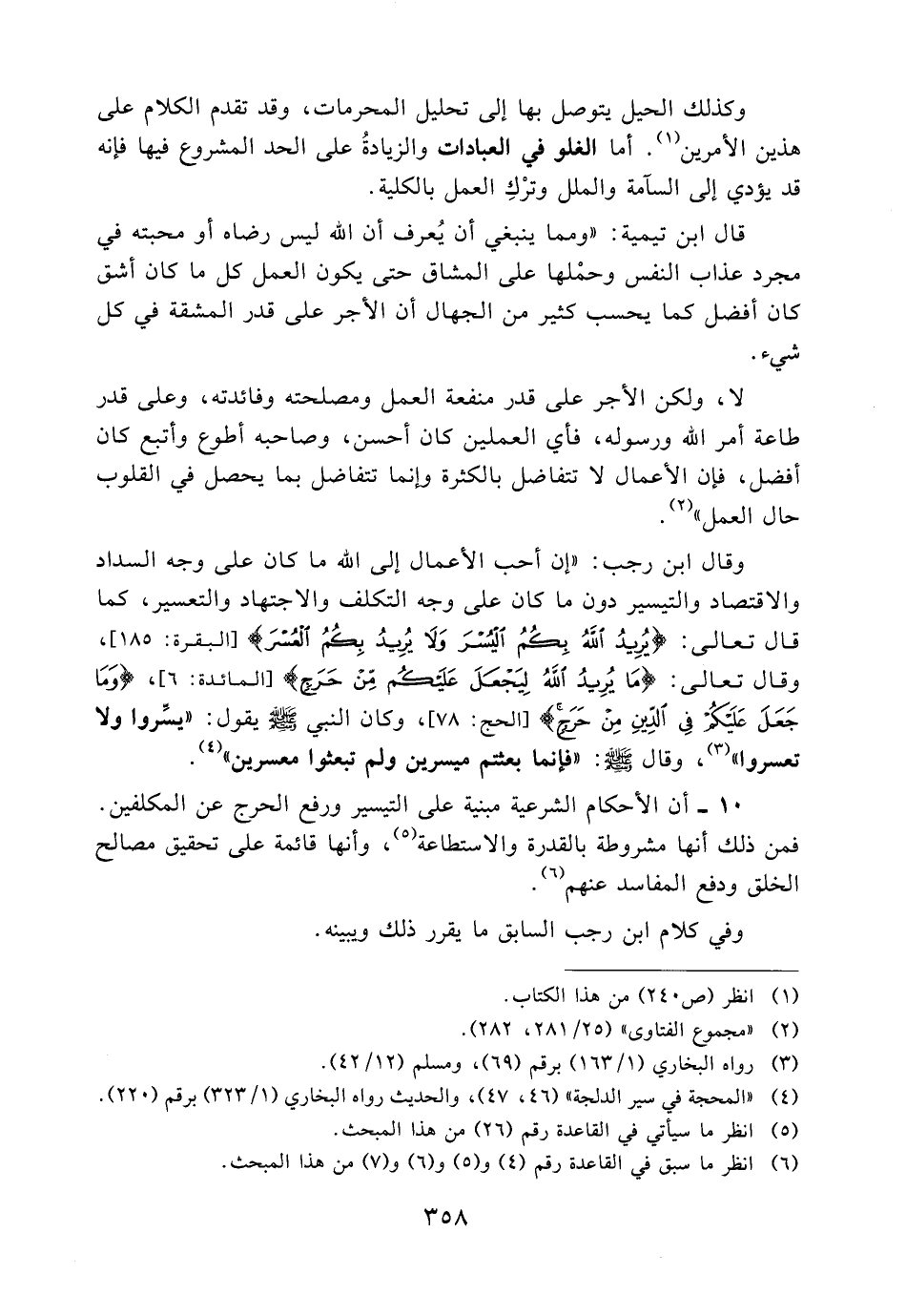 وقال ابن رجب: «إن أحب الأعمال إلى الله ما كان على وجه السداد والاقتصاد والتيسير دون ما كان على وجه التكلف والاجتهاد والتعسير، كما قال تعالى: {يُرِيدُ اللهُ بِكُمُ الْيُسْرَ وَلا يُرِيدُ بِكُمُ الْعُسْرَ} [البقرة: 185] ، وقال تعالى: {مَا يُرِيدُ اللهُ لِيَجْعَلَ عَلَيْكُمْ مِنْ حَرَجٍ} [المائدة: 6] ، وقال تعالى: {وَمَا جَعَلَ عَلَيْكُمْ فِي الدِّينِ مِنْ حَرَجٍ} [الحج: 78] ، وكان النبي - صلى الله عليه وسلم - يقول: «يسروا ولا تعسروا» (3) ، وقال - صلى الله عليه وسلم -: «فإنما بعثتم ميسرين ولم تبعثوا معسرين» (4) .