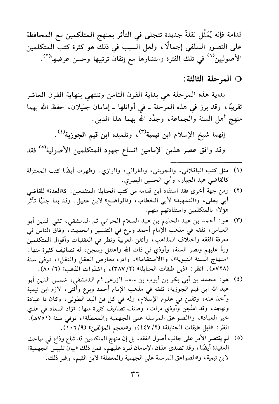 جديدة تتجلى في التأثر بمنهج المتكلمين مع المحافظة على التصور السلفي إجمالاً، ولعل السبب في ذلك هو كثرة كتب المتكلمين الأصوليين (1) في تلك الفترة وانتشارها مع إتقان ترتيبها وحسن عرضها (2) .