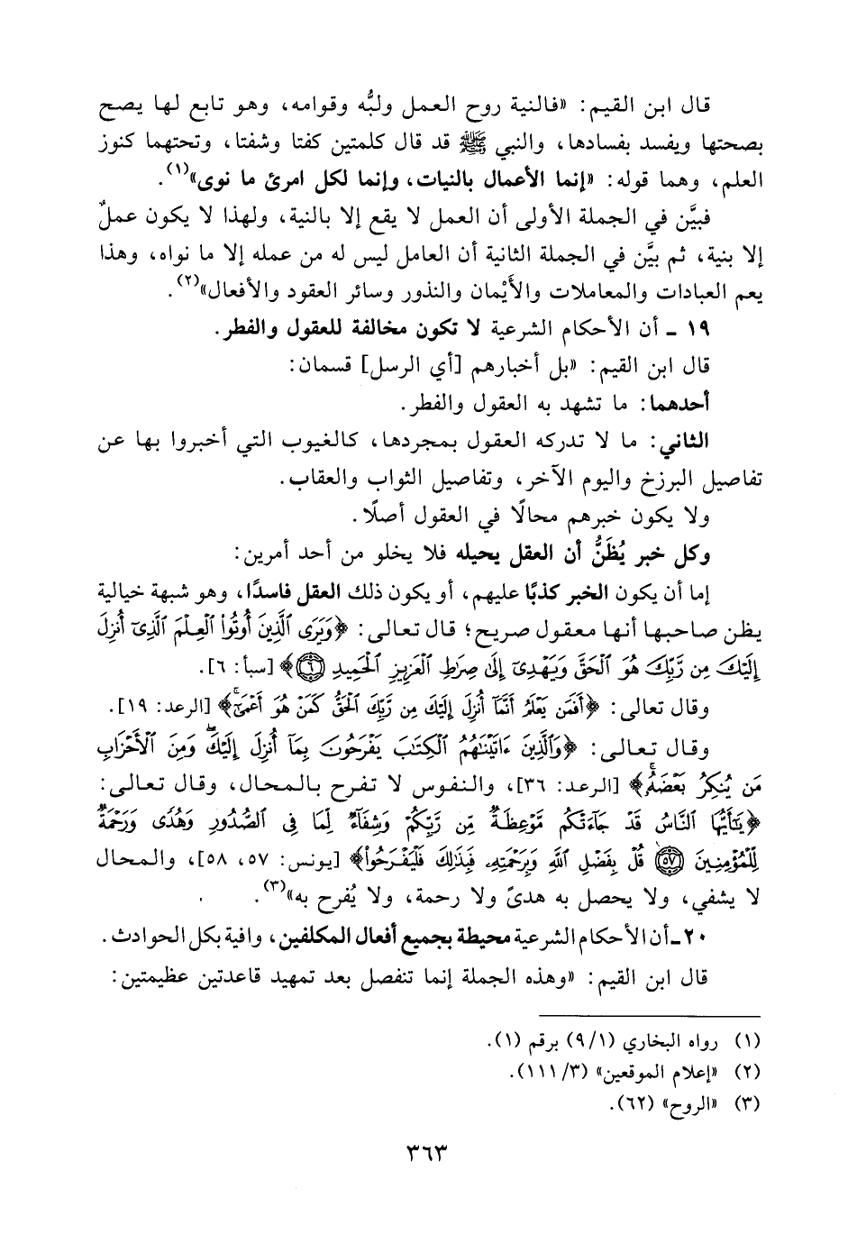 قال ابن القيم: «فالنية روح العمل ولبه وقوامه، وهو تابع لها يصح بصحتها ويفسد بفسادها، والنبي - صلى الله عليه وسلم - قد قال كلمتين كفتا وشفتا، وتحتهما كنوز العلم، وهما قوله: «إنما الأعمال بالنيات، وإنما لكل امرئ ما نوى» (2)