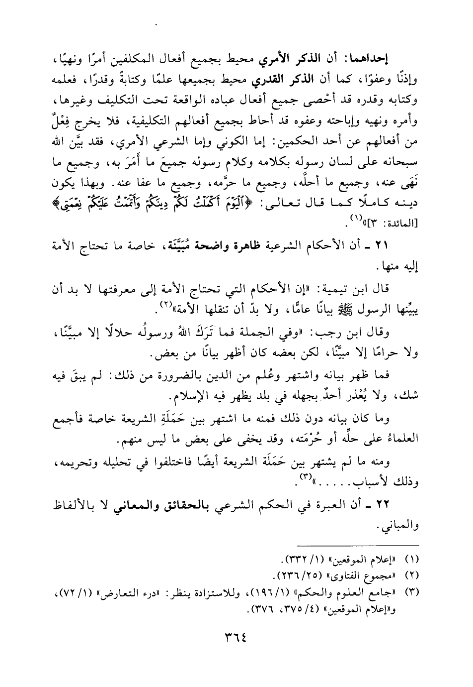 إحداهما: أن الذكر الأمري محيط بجميع أفعال المكلفين أمرًا ونهيًا، وإذنًا وعفوًا، كما أن الذكر القدري محيط بجميعها علمًا وكتابةً وقدرًا، فعلمه وكتابه وقدره قد أحصى جميع أفعال عباده الواقعة تحت التكليف وغيرها، وأمره ونهيه وإباحته وعفوه قد أحاط بجميع أفعالهم التكليفية، فلا يخرج فعل من أفعالهم عن أحد الحكمين: إما الكوني وإما الشرعي الأمري، فقد بين الله سبحانه على لسان رسوله بكلامه وكلام رسوله جميع ما أمر به، وجميع ما نهى عنه، وجميع ما أحله، وجميع ما حرمه، وجميع ما عفا عنه. وبهذا يكون دينه كاملاً كما قال تعالى: {الْيَوْمَ أَكْمَلْتُ لَكُمْ دِينَكُمْ وَأَتْمَمْتُ عَلَيْكُمْ نِعْمَتِي} [المائدة: 3] » (2) .