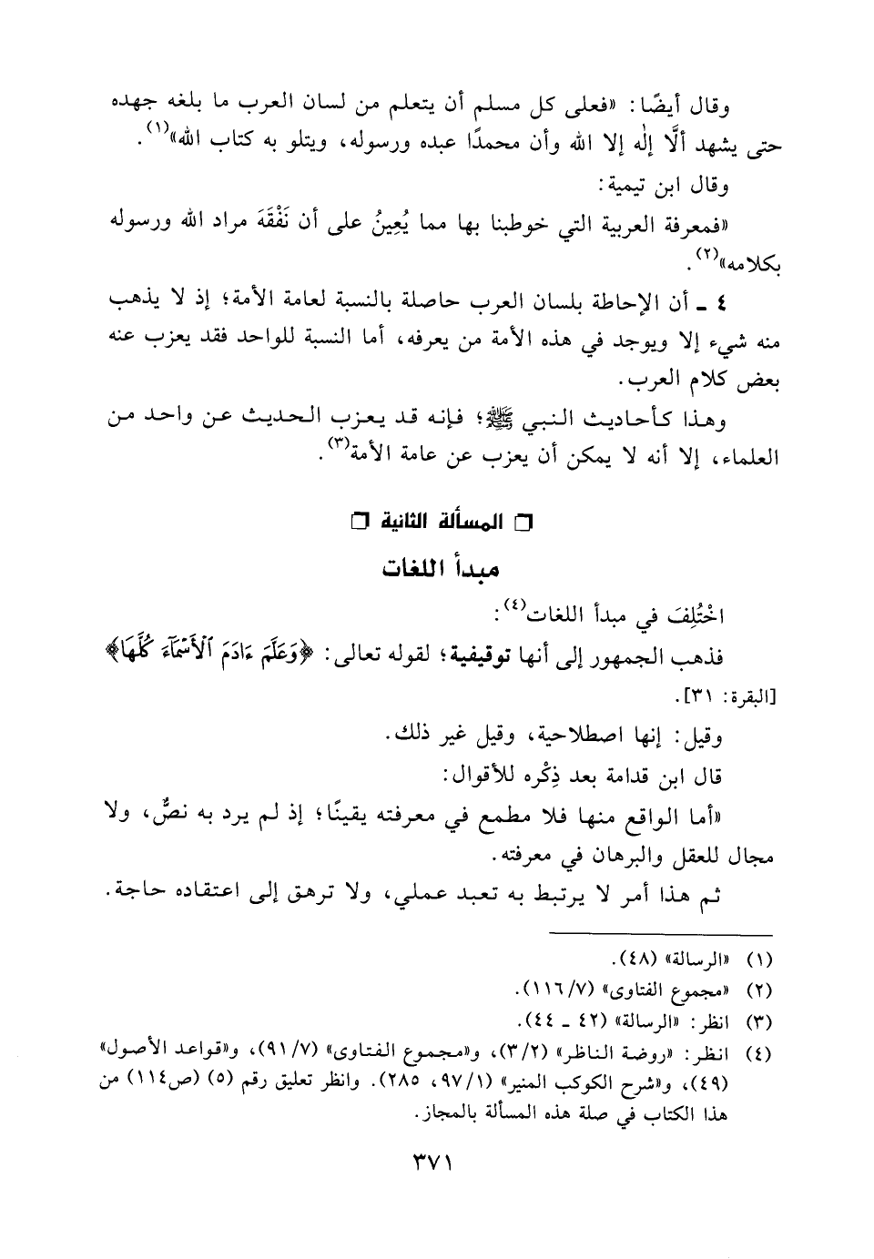 (4) انظر: "روضة الناظر" (2/3) ، و"مجموع الفتاوى" (7/91) ، و"قواعد الأصول" (49) ، و"شرح الكوكب المنير" (1/97، 285) . وانظر تعليق رقم (5) (ص114) من هذا الكتاب في صلة هذه المسألة بالمجاز.
