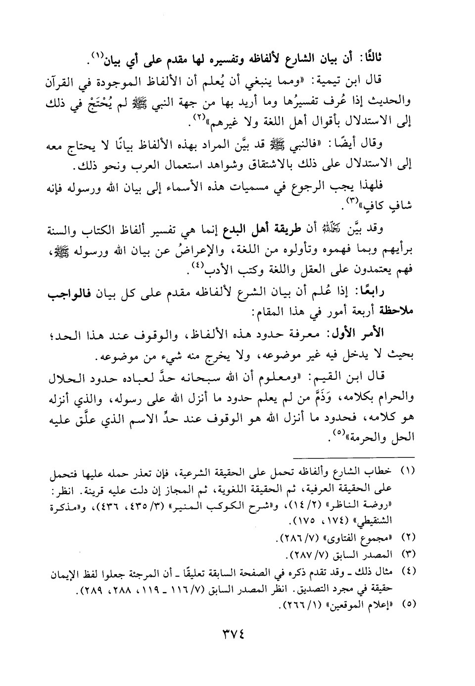 قال ابن القيم: «ومعلوم أن الله سبحانه حد لعباده حدود الحلال والحرام بكلامه؛ وذم من لم يعلم حدود ما أنزل الله على رسوله، والذي أنزله هو كلامه، فحدود ما أنزل الله هو الوقوف عند حد الاسم الذي علق عليه الحل والحرمة» (5) .