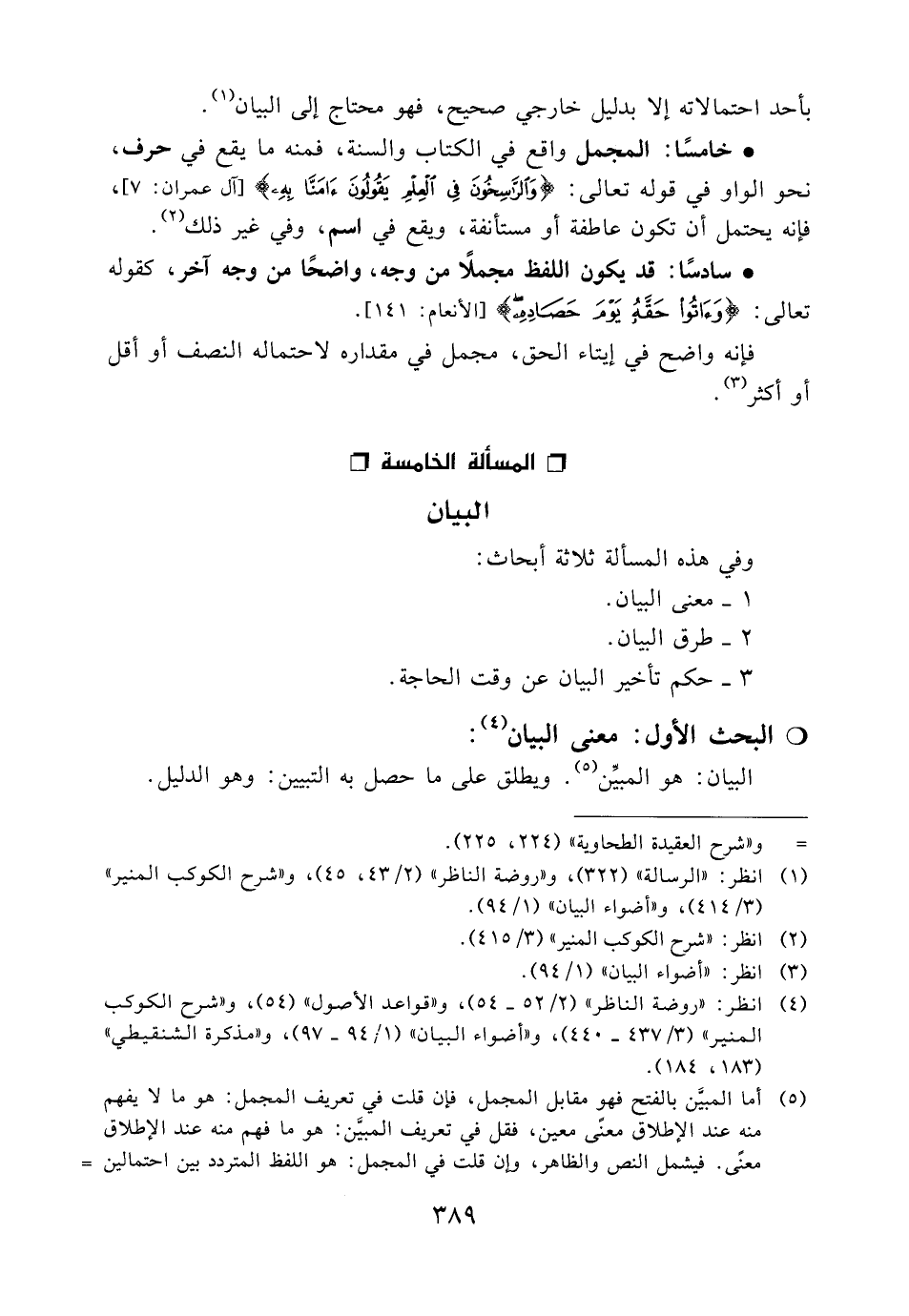 (خامسًا: المجمل واقع في الكتاب والسنة، فمنه ما يقع في حرف، نحو الواو في قوله تعالى: {وَالرَّاسِخُونَ فِي الْعِلْمِ يَقُولُونَ آمَنَّا بِهِ} [آل عمران: 7] ، فإنه يحتمل أن تكون عاطفة أو مستأنفة، ويقع في اسم، وفي غير ذلك (2) .