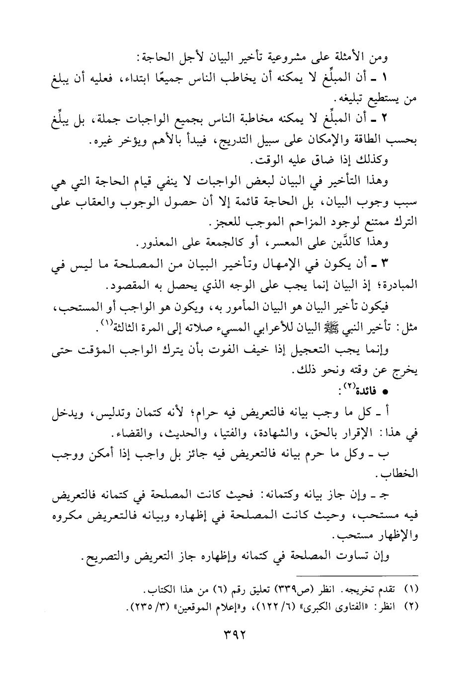 3- أن يكون في الإمهال وتأخير البيان من المصلحة ما ليس في المبادرة؛ إذ البيان إنما يجب على الوجه الذي يحصل به المقصود.