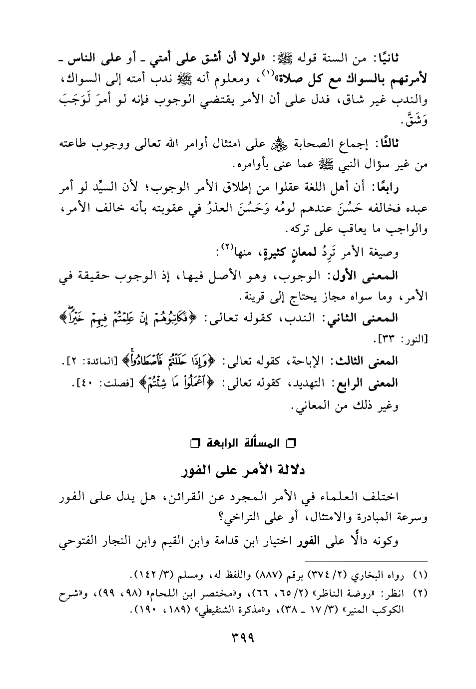 ثانيًا: من السنة قوله - صلى الله عليه وسلم -: «لولا أن أشق على أمتي - أو على الناس - لأمرتهم بالسواك مع كل صلاة» (1) ، ومعلوم أنه - صلى الله عليه وسلم - ندب أمته إلى السواك، والندب غير شاق، فدل على أن الأمر يقتضي الوجوب فإنه لو أمر لوجب وشق.