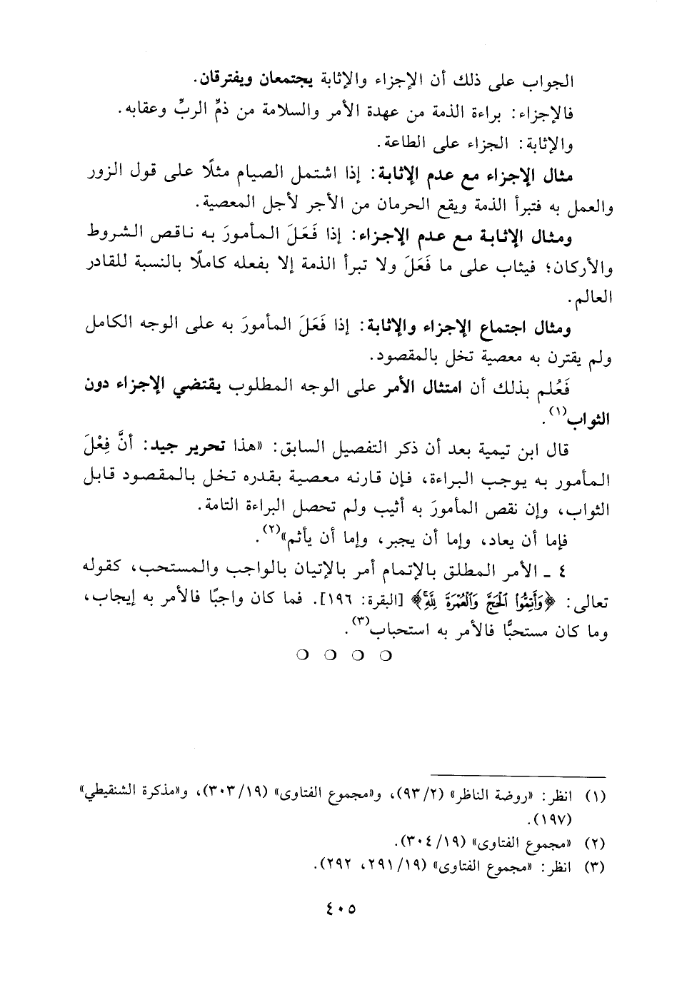 قال ابن تيمية بعد أن ذكر التفصيل السابق: «هذا تحرير جيد: أن فعل المأمور به يوجب البراءة، فإن قارنه معصية بقدره تخل بالمقصود قابل الثواب، وإن نقص المأمور به أثيب ولم تحصل البراءة التامة.
