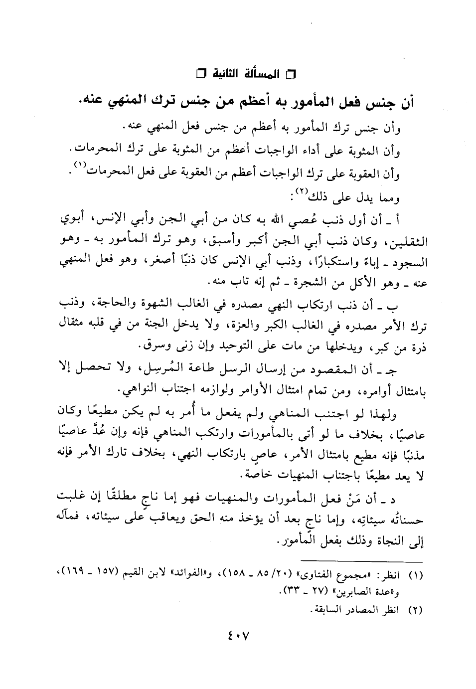 المسألة الثانية: أن جنس فعل المأمور به أعظم من جنس ترك المنهي عنه.