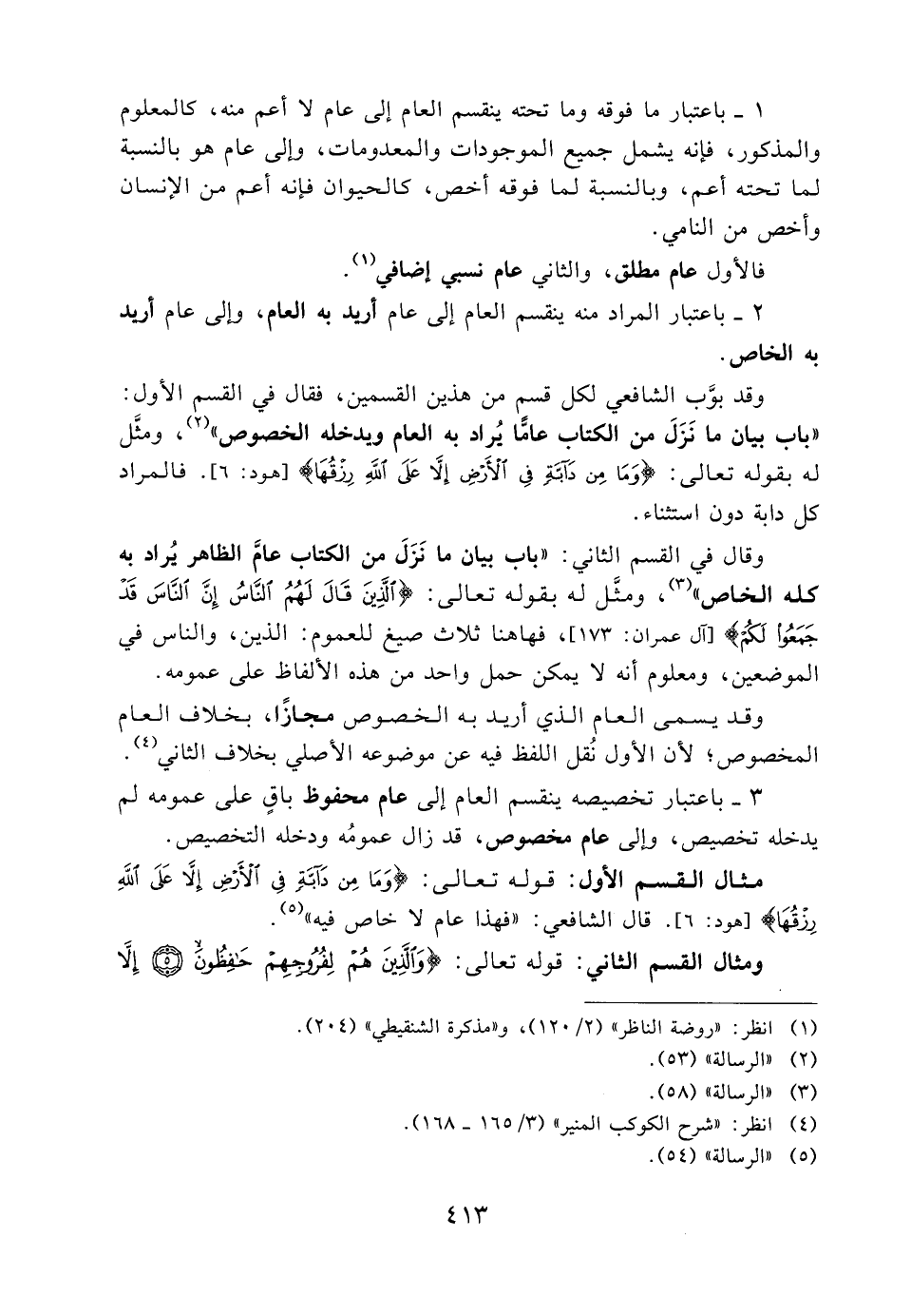 وقد بوب الشافعي لكل قسم من هذين القسمين، فقال في القسم الأول: «باب بيان ما نزل من الكتاب عامًا يُراد به العام ويدخله الخصوص» (2) ، ومثل له بقوله تعالى: {وَمَا مِنْ دَابَّةٍ فِي الأرْضِ إِلا عَلَى اللهِ رِزْقُهَا} [هود: 6] . فالمراد كل دابة دون استثناء.