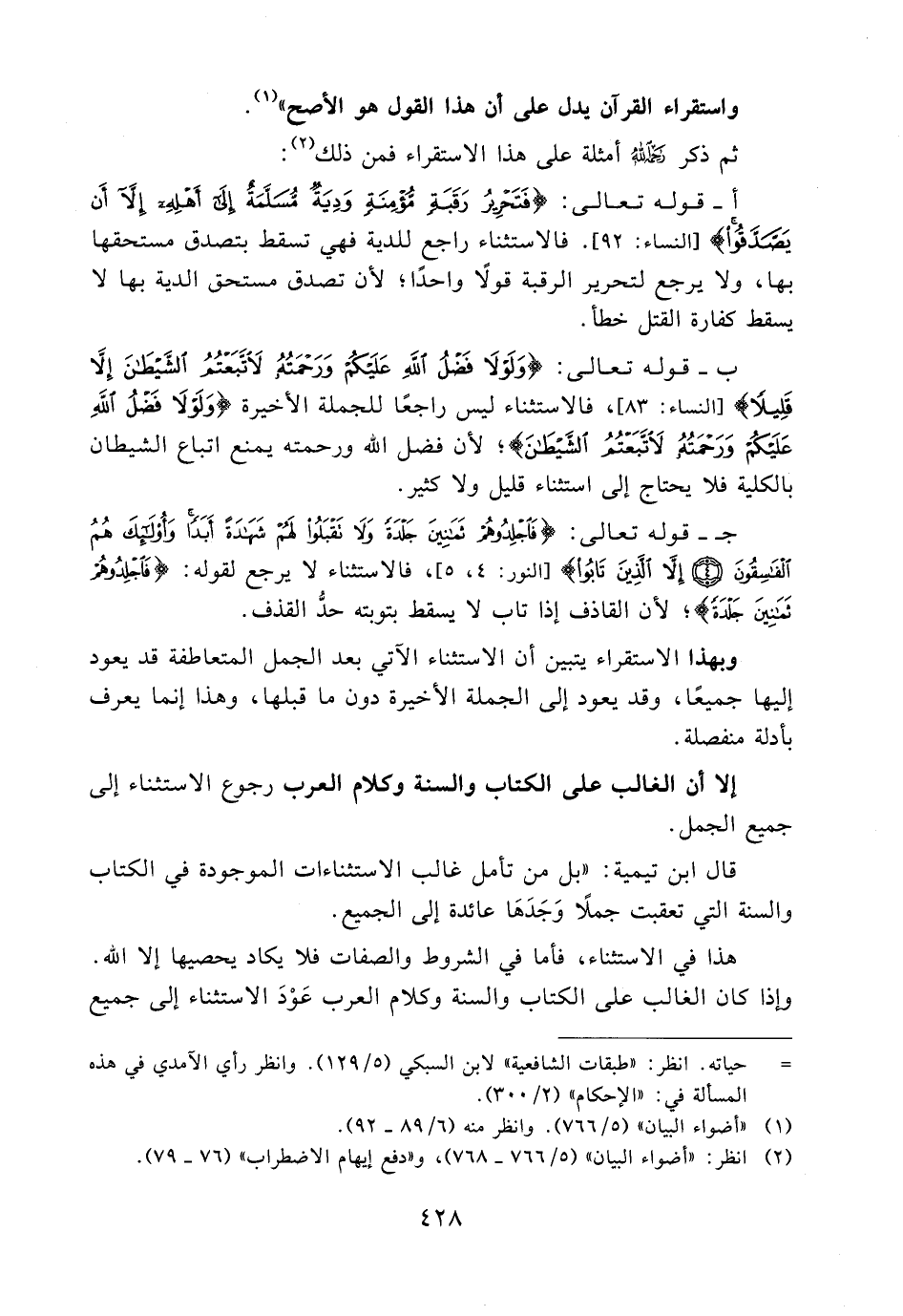 قال ابن تيمية: «بل من تأمل غالب الاستثناءات الموجودة في الكتاب والسنة التي تعقبت جملاً وجدها عائدة إلى الجميع.