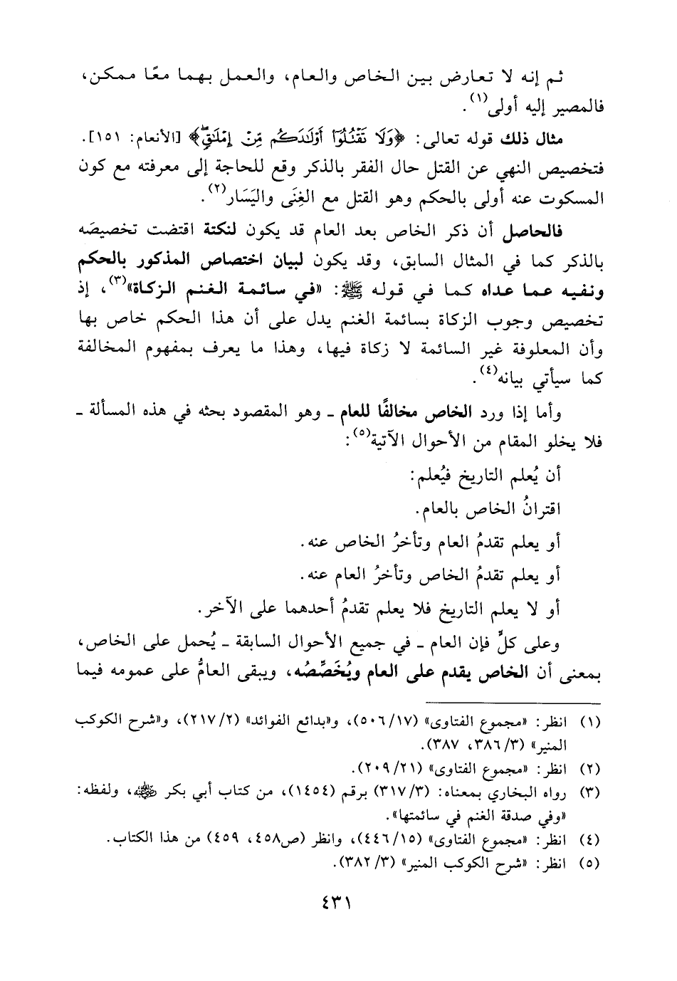 فالحاصل: أن ذكر الخاص بعد العام قد يكون لنكتة اقتضت تخصيصه بالذكر كما في المثال السابق، وقد يكون لبيان اختصاص المذكور بالحكم ونفيه عما عداه كما في قوله - صلى الله عليه وسلم -: «في سائمة الغنم الزكاة» (3) ، إذ تخصيص وجوب الزكاة بسائمة الغنم يدل على أن هذا الحكم خاص بها وأن المعلوفة غير السائمة لا زكاة فيها، وهذا ما يعرف بمفهوم المخالفة كما سيأتي بيانه (4) .
