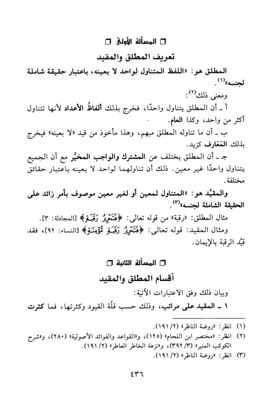 ومثال المقيد: قوله تعالى: {فَتَحْرِيرُ رَقَبَةٍ مُؤْمِنَةٍ} [النساء: 92] ، فقد قيد الرقبة بالإيمان.