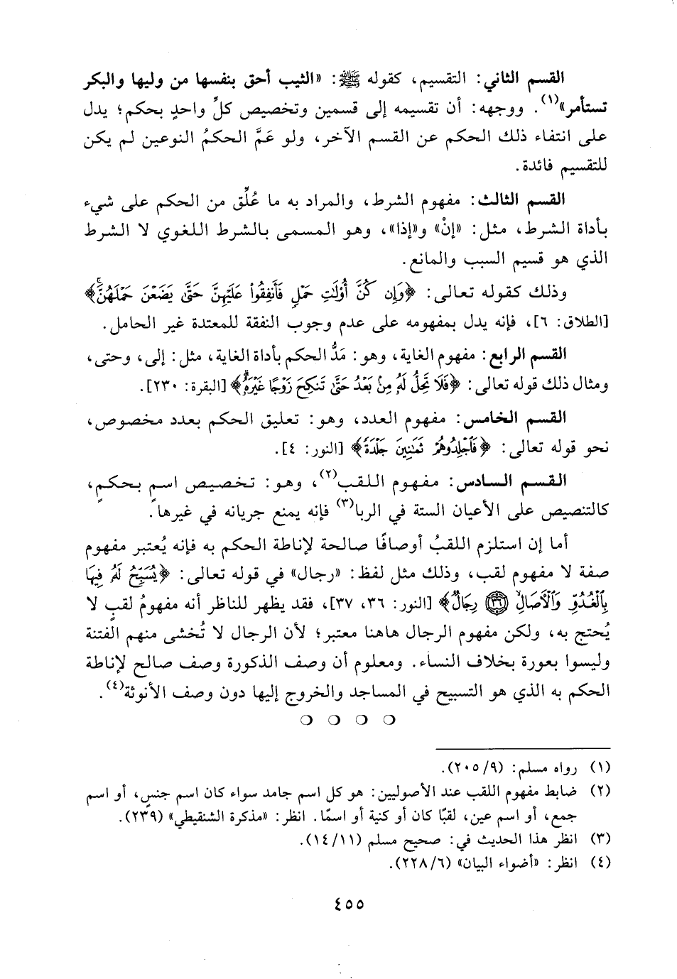 القسم الثاني: التقسيم، كقوله - صلى الله عليه وسلم -: «الثيب أحق بنفسها من وليها والبكر تستأمر» (1) . ووجهه: أن تقسيمه إلى قسمين وتخصيص كل واحدٍ بحكم؛ يدل على انتفاء ذلك الحكم عن القسم الآخر، ولو عم الحكم النوعين لم يكن للتقسيم فائدة.