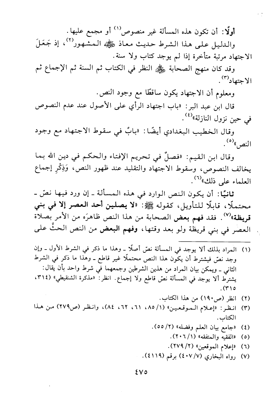 ثانيًا: أن يكون النص الوارد في هذه المسألة –إن ورد فيها نص– محتملاً، قابلاً للتأويل، كقوله - صلى الله عليه وسلم -: «لا يصلين أحد العصر إلا في بني قريظة» (7) . فقد فهم بعض الصحابة من هذا النص ظاهره من الأمر بصلاة العصر في بني قريظة ولو بعد وقتها، وفهم البعض من النص الحث على المسارعة في السير مع تأدية الصلاة في وقتها ولم ينكر - صلى الله عليه وسلم - على الفريقين ما فهم،