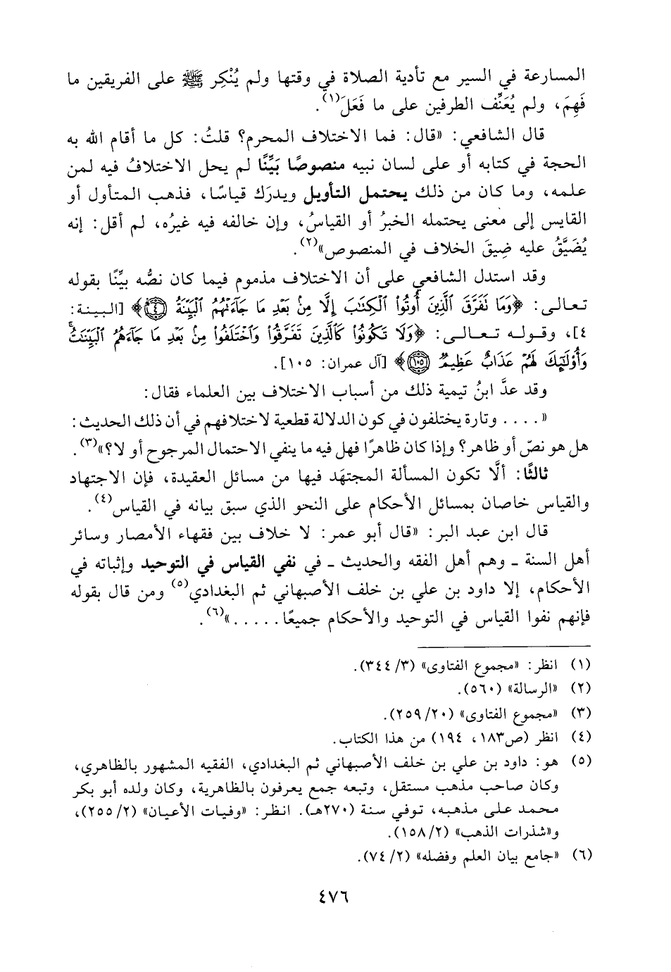 قال ابن عبد البر: «قال أبو عمر: لا خلاف بين فقهاء الأمصار وسائر أهل السنة - وهم أهل الفقه والحديث - في نفي القياس في التوحيد وإثباته في الأحكام، إلا داود بن علي بن خلف الأصبهاني ثم البغدادي (5) ومن قال بقوله