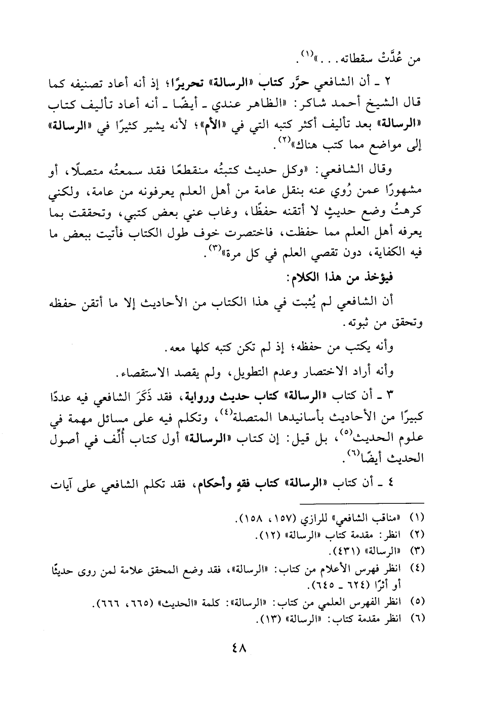 2- أن الشافعي حرر كتاب "الرسالة" تحريرًا؛ إذ أنه أعاد تصنيفه كما قال الشيخ أحمد شاكر: "الظاهر عندي – أيضًا – أنه أعاد تأليف كتاب "الرسالة" بعد تأليف أكثر كتبه التي في "الأم"؛ لأنه يشير كثيرًا في "الرسالة" إلى مواضع مما كتب هناك" (2) .