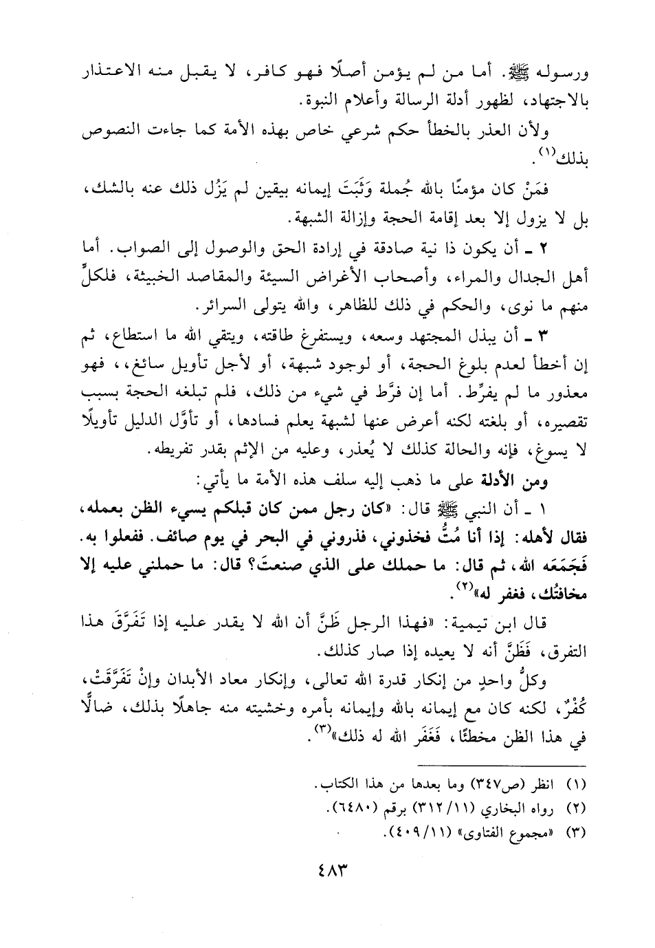 3- أن يبذل المجتهد وسعه، ويستفرغ طاقته، ويتقي الله ما استطاع، ثم إن أخطأ لعدم بلوغ الحجة، أو لوجود شبهة، أو لأجل تأويل سائغ، فهو معذور ما لم يفرط. أما إن فرط في شيء من ذلك، فلم تبلغه الحجة بسبب تقصيره، أو بلغته لكنه أعرض عنها لشبهة يعلم فسادها، أو تأول الدليل تأويلاً لا يسوغ، فإنه والحالة كذلك لا يُعذر، وعليه من الإثم بقدر تفريطه.