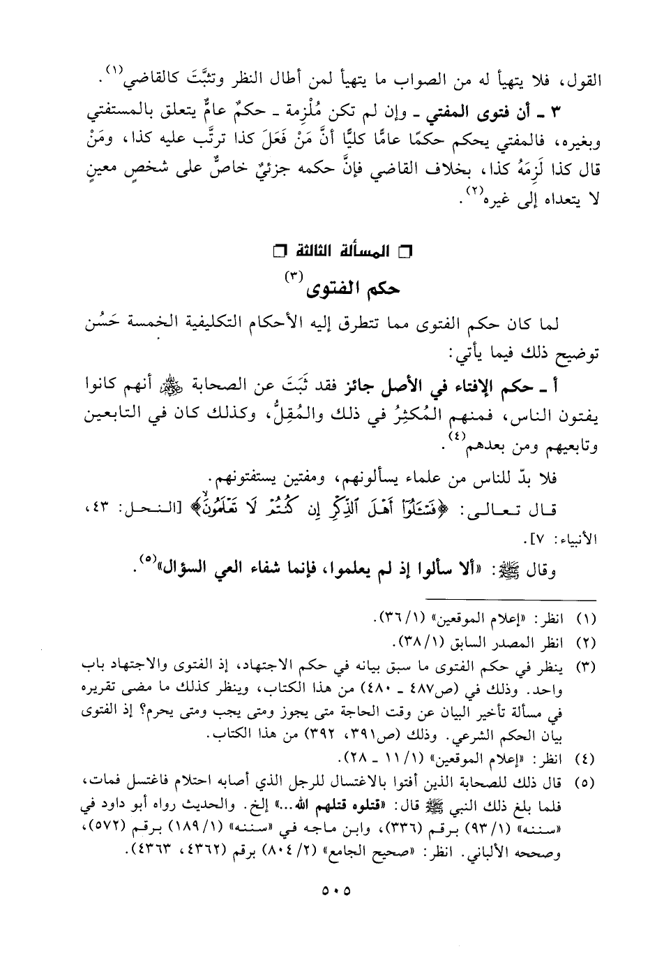 (3) ينظر في حكم الفتوى ما سبق بيانه في حكم الاجتهاد، إذ الفتوى والاجتهاد باب واحد. وذلك في (ص478- 480) من هذا الكتاب، وينظر كذلك ما مضى تقريره في مسألة تأخير البيان عن وقت الحاجة متى يجوز ومتى يجب ومتى يحرم؟ إذ الفتوى بيان الحكم الشرعي. وذلك (ص391، 392) من هذا الكتاب.