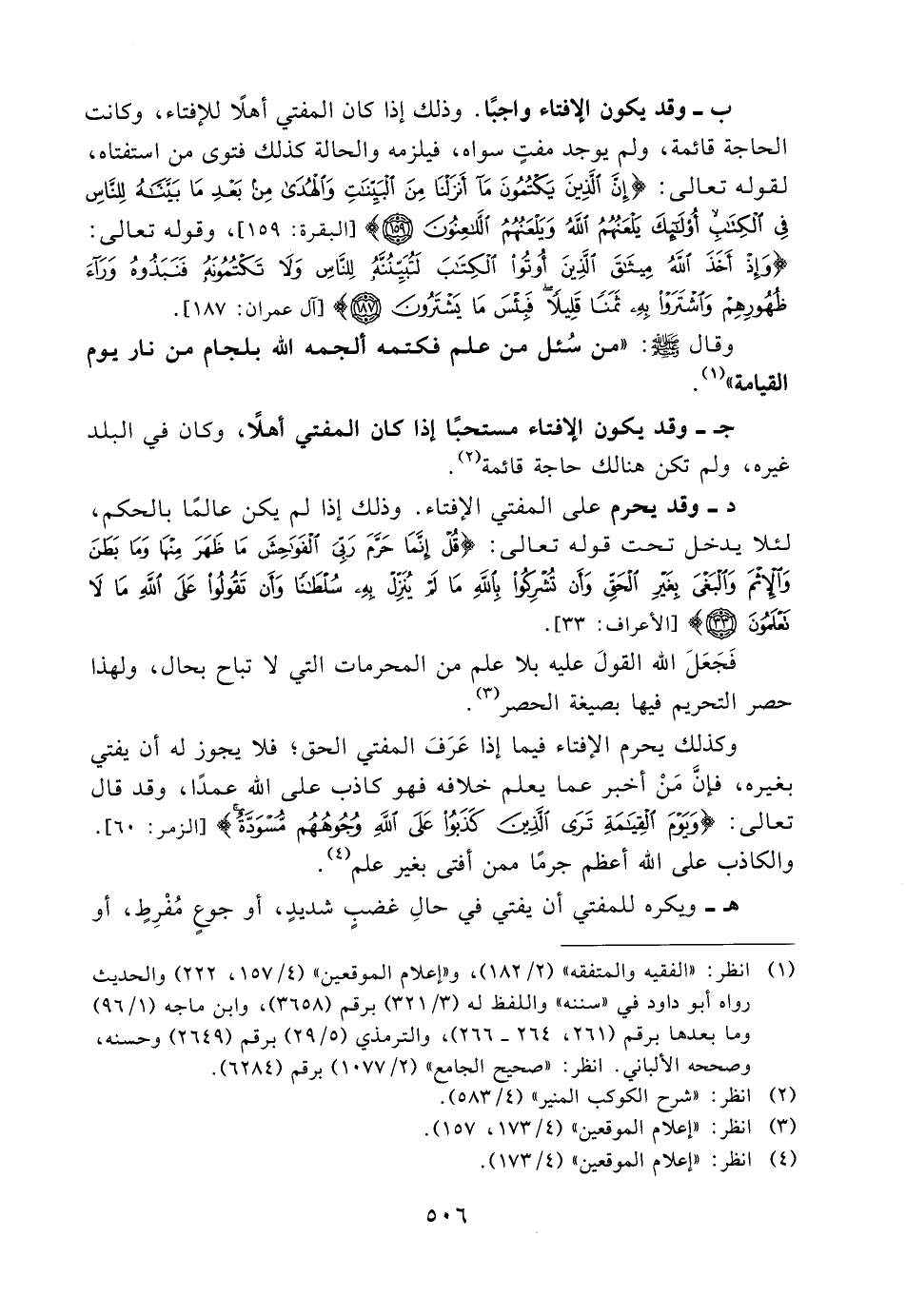 د- وقد يحرم على المفتي الإفتاء. وذلك إذا لم يكن عالمًا بالحكم، لئلا يدخل تحت قوله تعالى: {قُلْ إِنَّمَا حَرَّمَ رَبِّيَ الْفَوَاحِشَ مَا ظَهَرَ مِنْهَا وَمَا بَطَنَ وَالإثْمَ وَالْبَغْيَ بِغَيْرِ الْحَقِّ وَأَنْ تُشْرِكُوا بالله مَا لَمْ يُنَزِّلْ بِهِ سُلْطَانًا وَأَنْ تَقُولُوا عَلَى اللهِ مَا لا تَعْلَمُونَ} [الأعراف: 33] .
