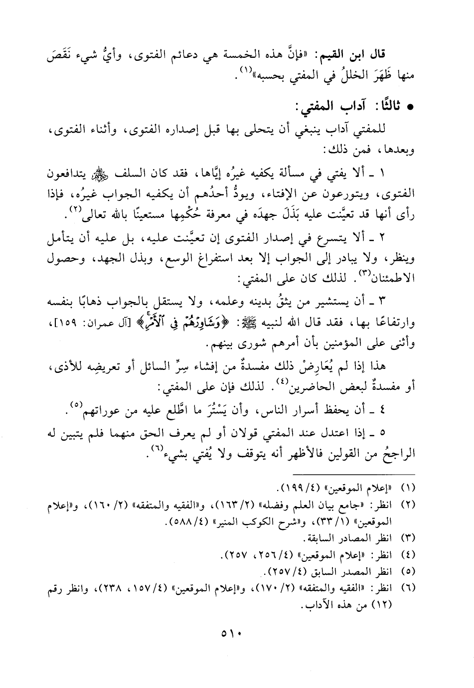 قال ابن القيم: «فإن هذه الخمسة هي دعائم الفتوى، وأي شيء نقص منها ظهر الخلل في المفتي بحسبه» (1) .