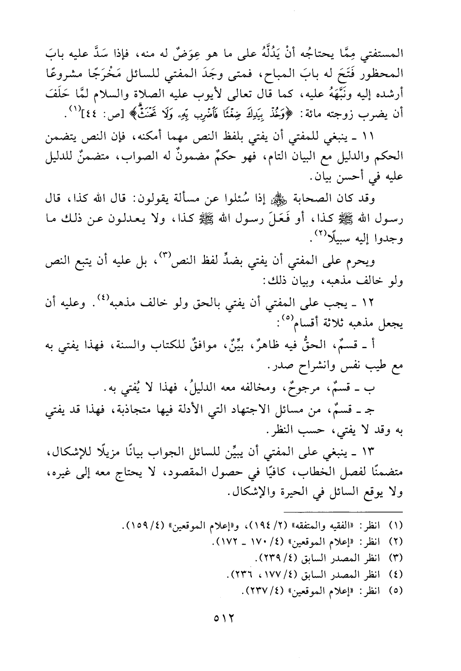 11- ينبغي للمفتي أن يفتي بلفظ النص مهما أمكنه، فإن النص يتضمن الحكم والدليل مع البيان التام، فهو حكم مضمون له الصواب، متضمن للدليل عليه في أحسن بيان.