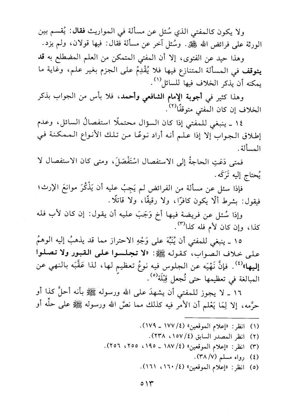 15- ينبغي للمفتي أن ينبه على وجه الاحتراز مما قد يذهب إليه الوهم على خلاف الصواب، كقوله - صلى الله عليه وسلم -: «لا تجلسوا على القبور ولا تصلوا إليها» (4) . فإن نهيه عن الجلوس فيه نوع تعظيمٍ لها، لذا عقبه بالنهي عن المبالغة في تعظيمها حتى تجعل قبلة (5) .