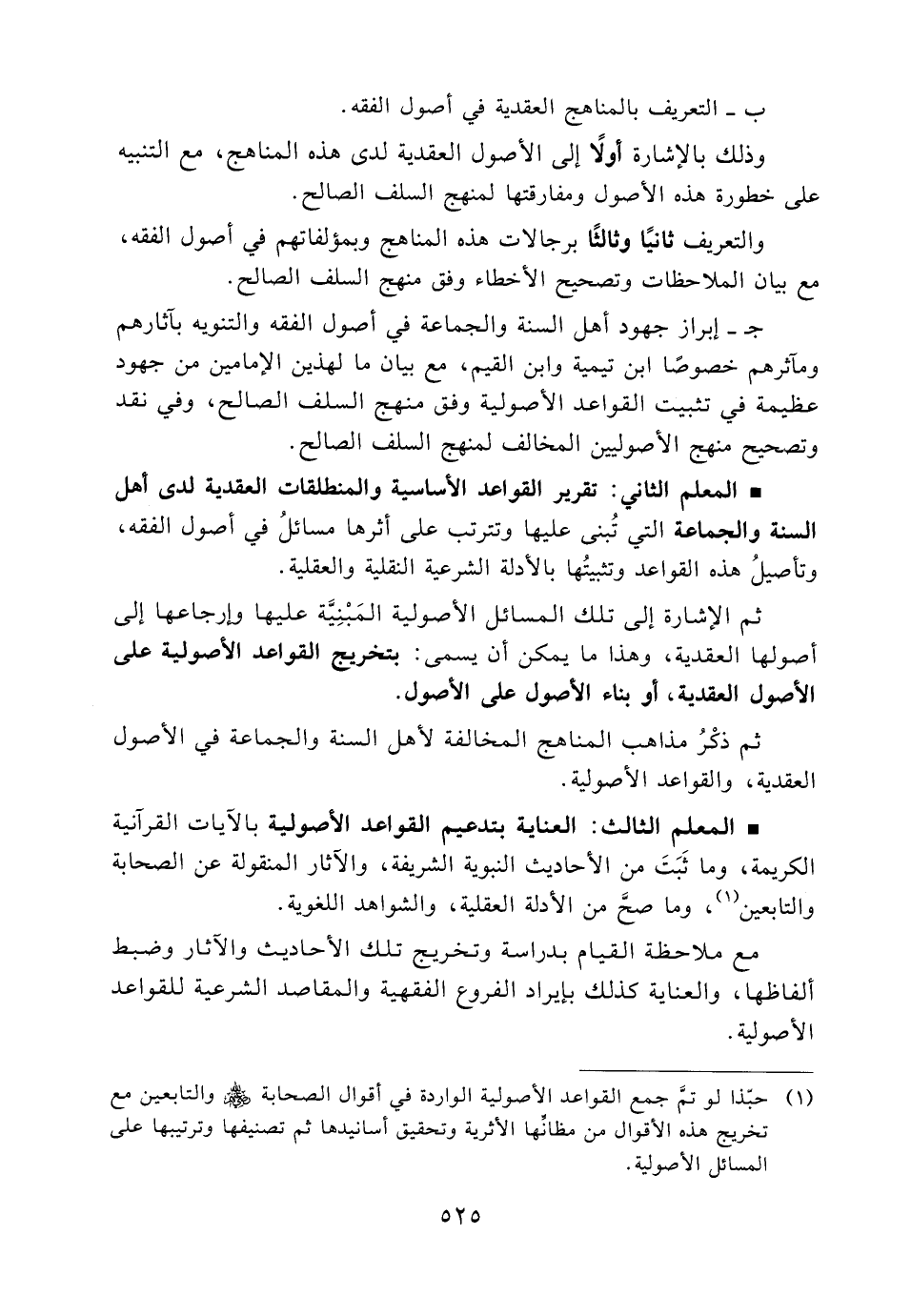 والتعريف ثانيًا وثالثًا برجالات هذه المناهج وبمؤلفاتهم في أصول الفقه، مع بيان الملاحظات وتصحيح الأخطاء وفق منهج السلف الصالح.