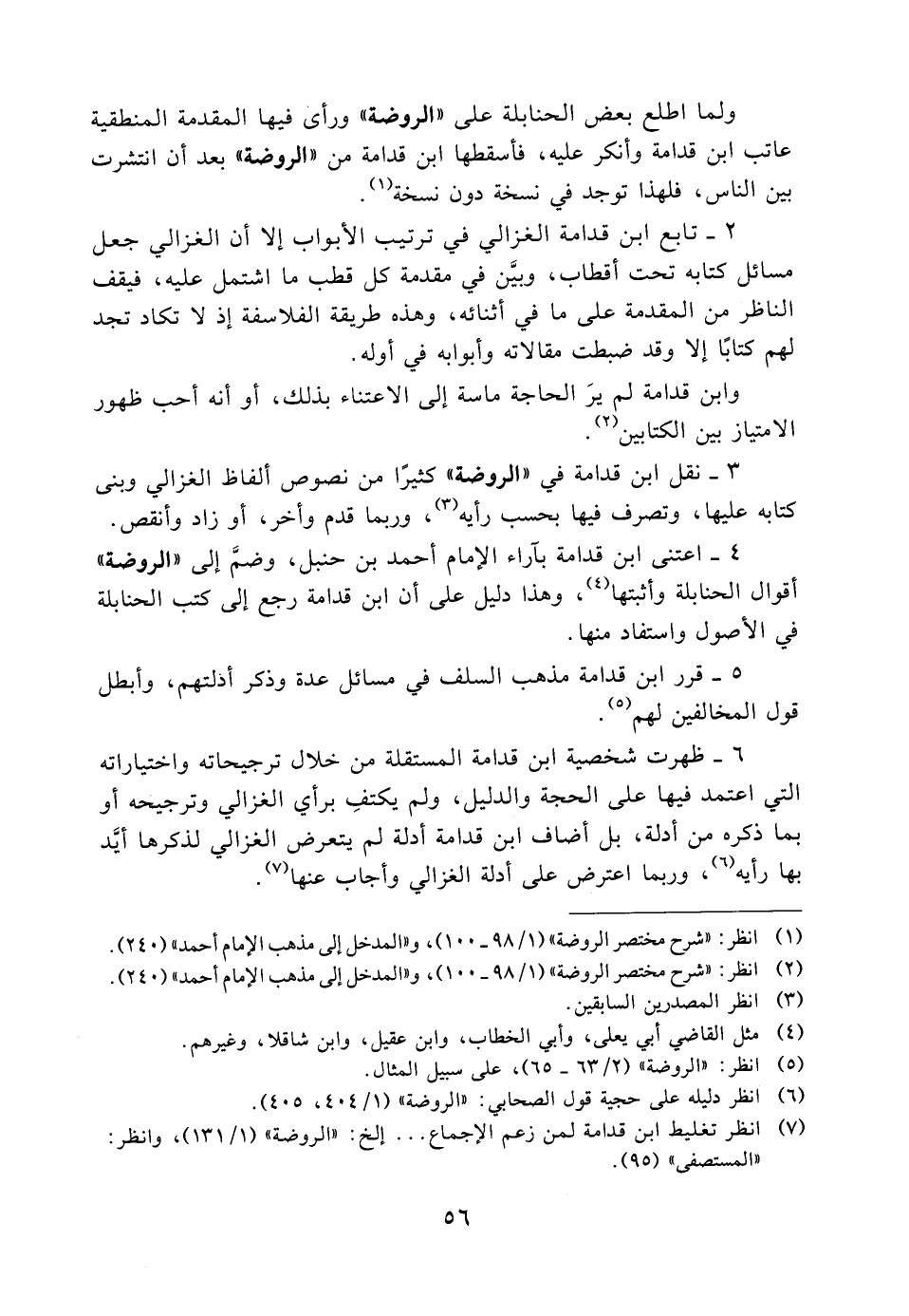 ولما اطلع بعض الحنابلة على "الروضة" ورأى فيها المقدمة المنطقية عاتب ابن قدامة وأنكر عليه، فأسقطها ابن قدامة من "الروضة" بعد أن انتشرت بين الناس، فلهذا توجد في نسخة دون نسخة (1) .