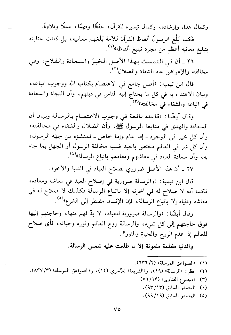وقال أيضًا: "قاعدة نافعة في وجوب الاعتصام بالرسالة وبيان أن السعادة والهدي في متابعة الرسول - صلى الله عليه وسلم -، وأن الضلال والشقاء في مخالفته، وأن كل خير في الوجود -إما عام وإما خاص- فمنشؤه من جهة الرسول، وأن كل شر في العالم مختص بالعبد فسببه مخالفة الرسول أو الجهل بما جاء به، وأن سعادة العباد في معاشهم ومعادهم باتباع الرسالة" (4) .