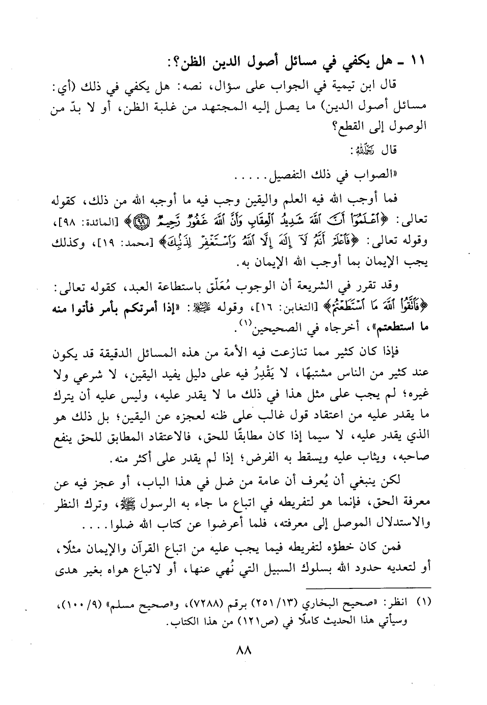 قال ابن تيمية في الجواب على سؤال، نصه: هل يكفي في ذلك (أي: مسائل أصول الدين) ما يصل إليه المجتهد من غلبة الظن، أو لا بد من الوصول إلى القطع؟