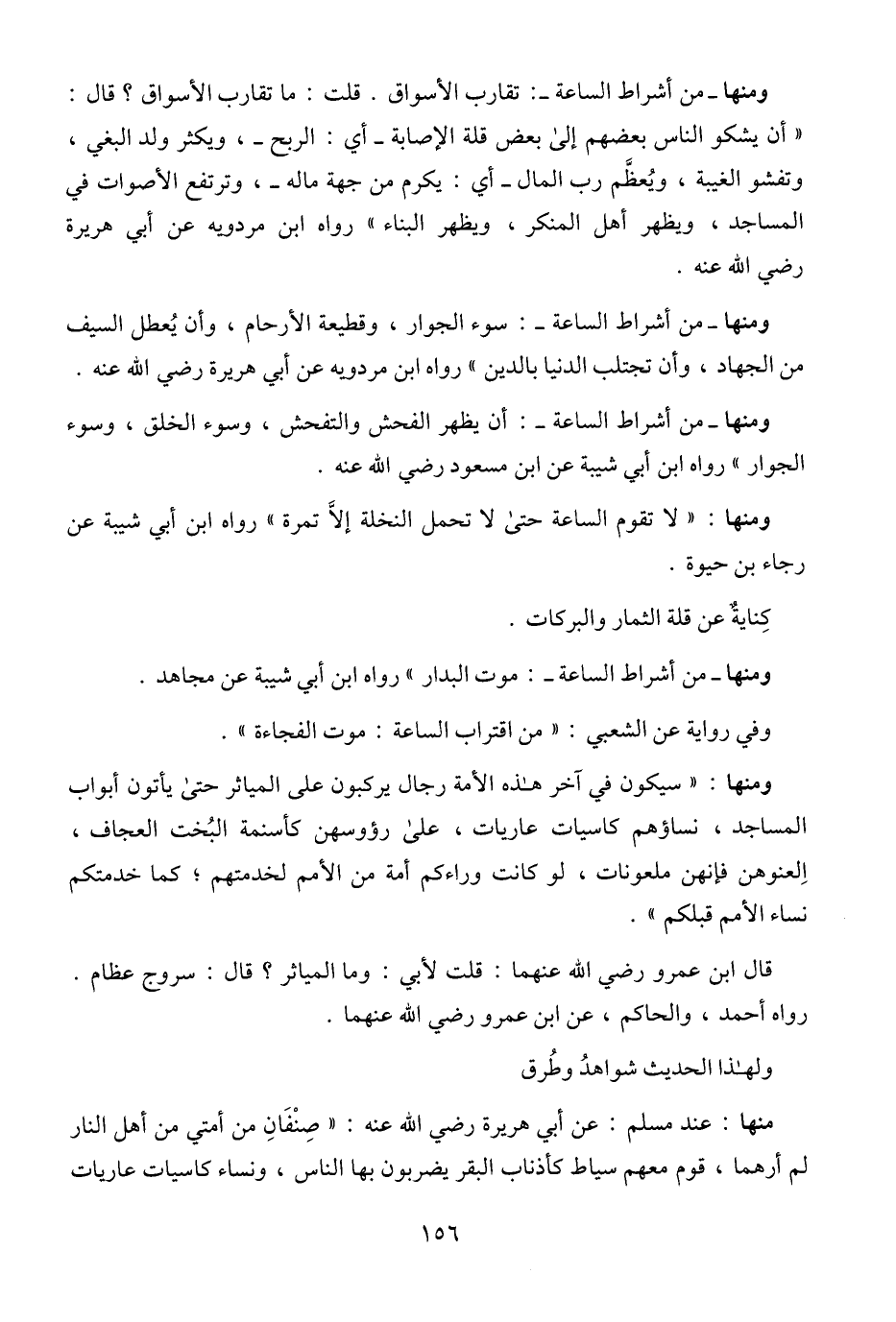 ومنها: "سيكون في آخر هذه الأمة رجال يركبون على المياثر حتى يأتون أبواب المساجد، نساؤهم كاسيات عاريات، على رؤوسهن كأسنمة البُخت العجاف، العنوهن فإنهن ملعونات، لو كانت وراءكم أمة من الأمم لخدمتهم؛ كما خدمتكم نساء الأمم قبلكم".