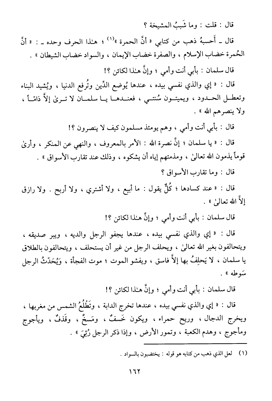 قال: "إي والذي نفسي بيده، عندها يجفو الرجل والديه، ويبر صديقه، ويتحالفون بغير الله تعالى، ويحلف الرجل من غير أن يستحلف، ويتحالفون بالطلاق يا سلمان، لا يَحلِفُ بها إلَّا فاسق، ويفشو الموت؛ موت الفجأة، وَيُحَدّثُ الرجل سَوطه".