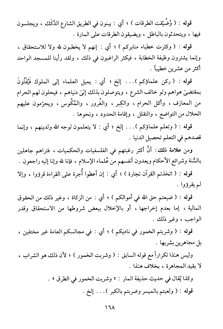 قوله: (وكثرت خطباء منابركم)؛ أي: إنهم لا يخطبون لله ولا للاستحقاق، وإنما يشترون وظيفة الخطابة، فيكثر الراغبون في ذلك، ولقد رأينا للمسجد الواحد أكثر من عشرين خطيبًا.
