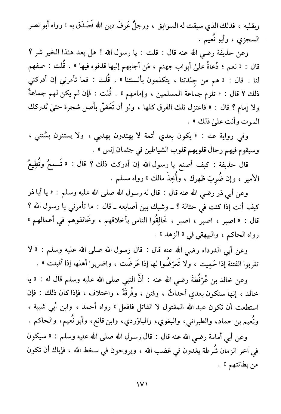 وعن خالد بن عُرْفُطةَ - رضي الله عنه -: أنَّ النبي - صلى الله عليه وسلم - قال له: "يا خالد، إنها ستكون بعدي أحداثٌ، وفتن، وفُرقَةٌ، واختلاف، فإذا كان ذلك: فإن استطعت أن تكون عبد الله المقتول لا القاتل فافعل" رواه أحمد، وابن أبي شيبة، ونُعيم بن حماد، والطبراني، والبغوي، والباوَردي، وابن قانع، وأبو نُعيم، والحاكم.