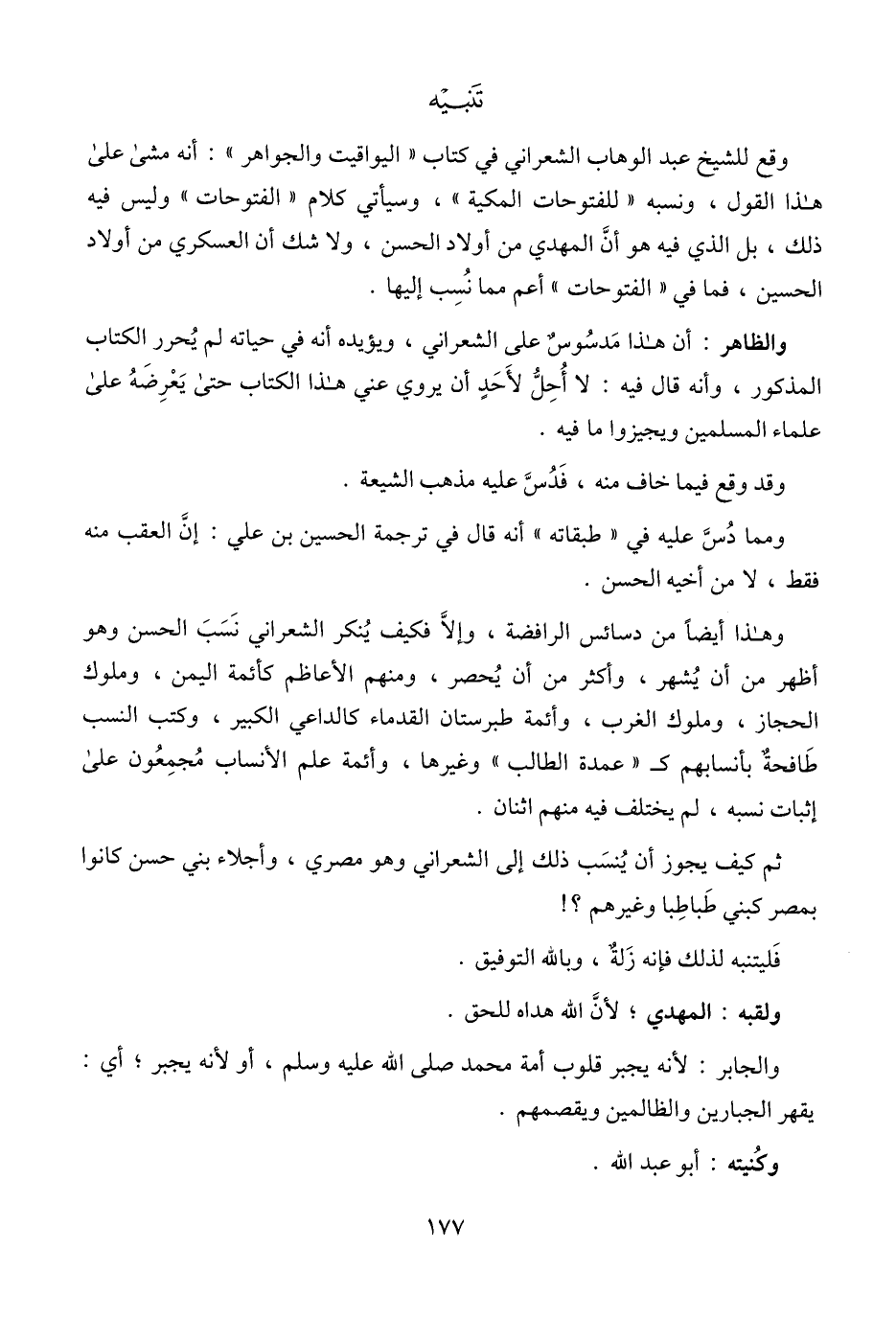 وقع للشيخ عبد الوهاب الشعراني في كتاب "اليواقيت والجواهر": أنه مشى على هذا القول، ونسبه "للفتوحات المكية"، وسيأتي كلام "الفتوحات" وليس فيه ذلك، بل الذي فيه هو أنَّ المهدي من أولاد الحسن، ولا شك أن العسكري من أولاد الحسين، فما في "الفتوحات" أعم مما نُسِب إليها.