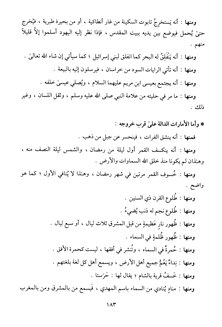 ومنها: أنه ينكسف القمر أول ليلة من رمضان، والشمس ليلة النصف منه، وهذان لم يكونا منذ خلق الله السماوات والأرض.