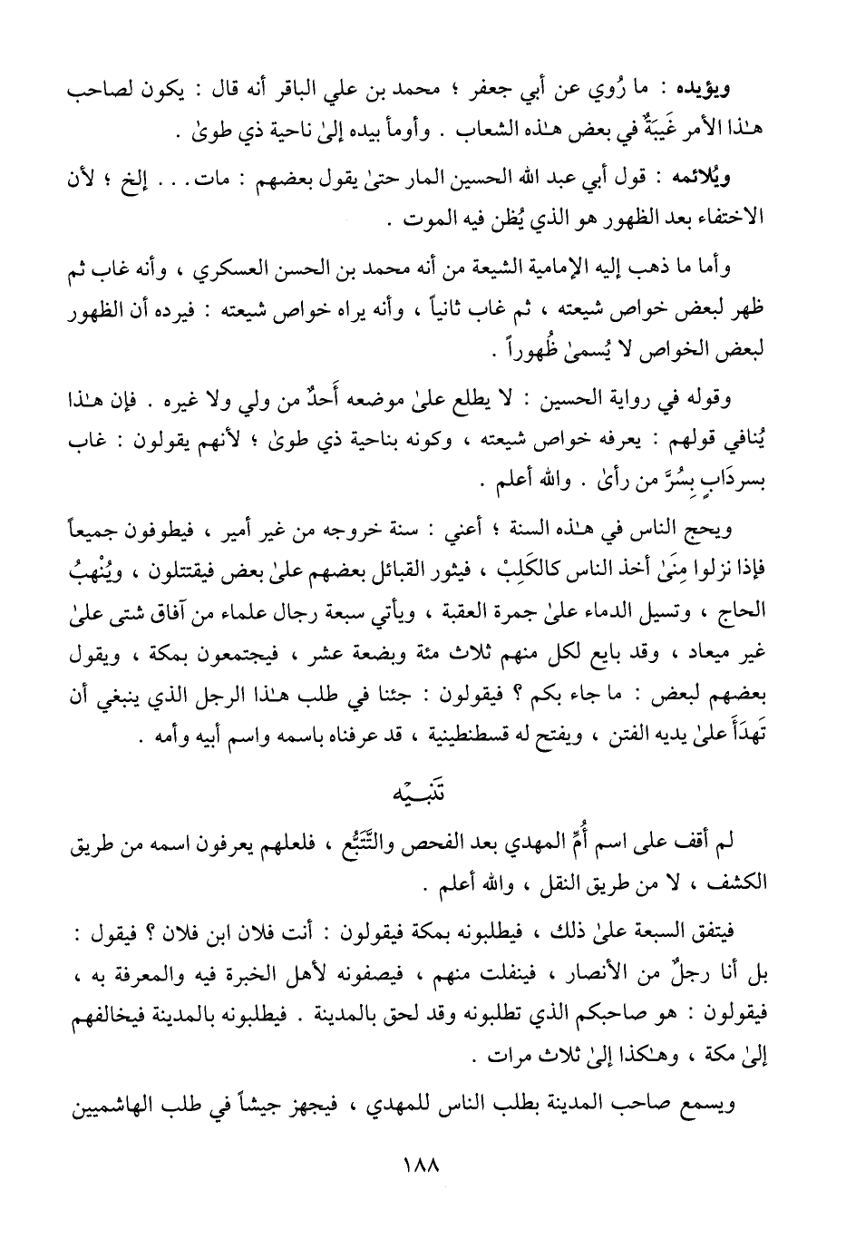 وأما ما ذهب إليه الإمامية الشيعة من أنه محمد بن الحسن العسكري، وأنه غاب ثم ظهر لبعض خواص شيعته، ثم غاب ثانيًا، وأنه يراه خواص شيعته: فيرده أن الظهور لبعض الخواص لا يُسمى ظُهورًا.