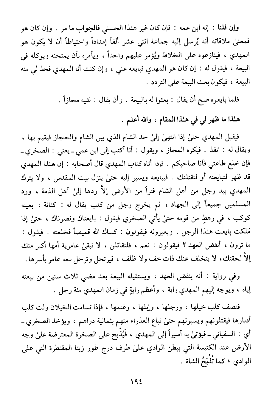 وإن قلنا: إنه ابن عمه: فإن كان غير هذا الحسني فالجواب ما مر. وإن كان هو فمعنى ملاقاته أنه يُرسل إليه جماعة اثني عشر ألفًا إمدادًا واحتياطًا أن لا يكون هو المهدي، فينازعوه على الخلافة ويُؤمر عليهم واحدًا، ويأمره بأن يمتحنه ويوكله في البيعة، فيقول له: إن كان هو المهدي فبايعه عني، وإن كنت أنا المهدي فخذ لي منه البيعة، فيكون بعث البيعة على التردد.