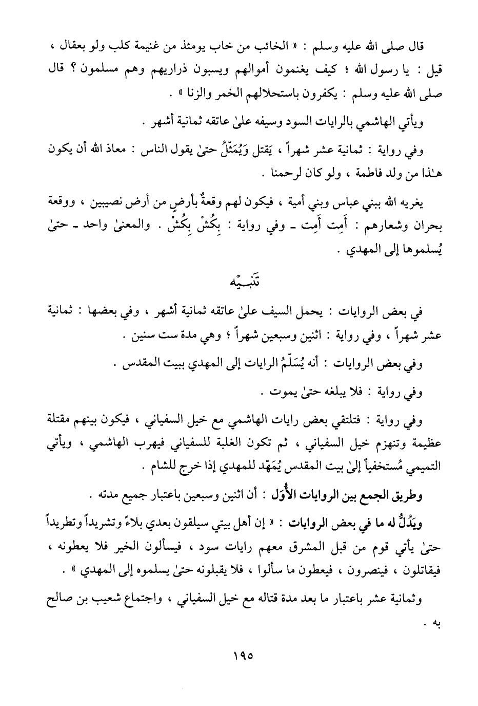 وفي رواية: فتلتقي بعض رايات الهاشمي مع خيل السفياني، فيكون بينهم مقتلة عظيمة وتنهزم خيل السفياني، ثم تكون الغلبة للسفياني فيهرب الهاشمي، ويأتي التميمي مُستخفيًا إلى بيت المقدس يُمَهّد للمهدي إذا خرج للشام.