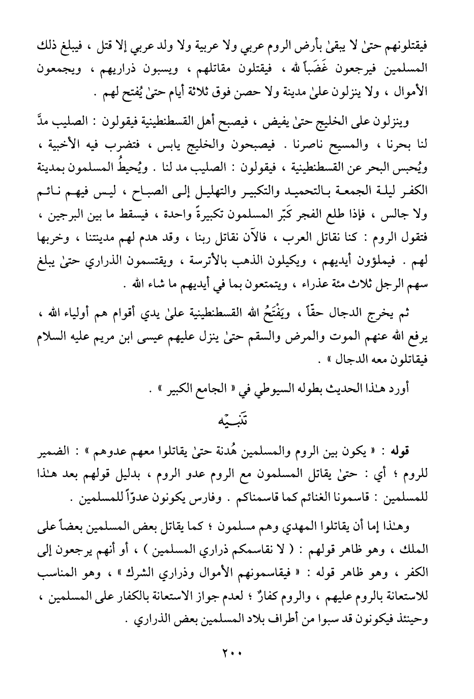 وينزلون على الخليج حتى يفيض، فيصبح أهل القسطنطينية فيقولون: الصليب مدَّ لنا بحرنا، والمسيح ناصرنا. فيصبحون والخليج يابس، فتضرب فيه الأخبية، ويُحبس البحر عن القسطنطينية، فيقولون: الصليب مد لنا. ويُحيطُ المسلمون بمدينة الكفر ليلة الجمعة بالتحميد والتكبير والتهليل إلى الصباح، ليس فيهم نائم ولا جالس، فإذا طلع الفجر كَبّر المسلمون تكبيرةً واحدة، فيسقط ما بين البرجين، فتقول الروم: كنا نقاتل العرب، فالآن نقاتل ربنا، وقد هدم لهم مدينتنا، وخربها لهم. فيملؤون أيديهم، ويكيلون الذهب بالأترسة، ويقتسمون الذراري حتى يبلغ سهم الرجل ثلاث مئة عذراء، ويتمتعون بما في أيديهم ما شاء الله.