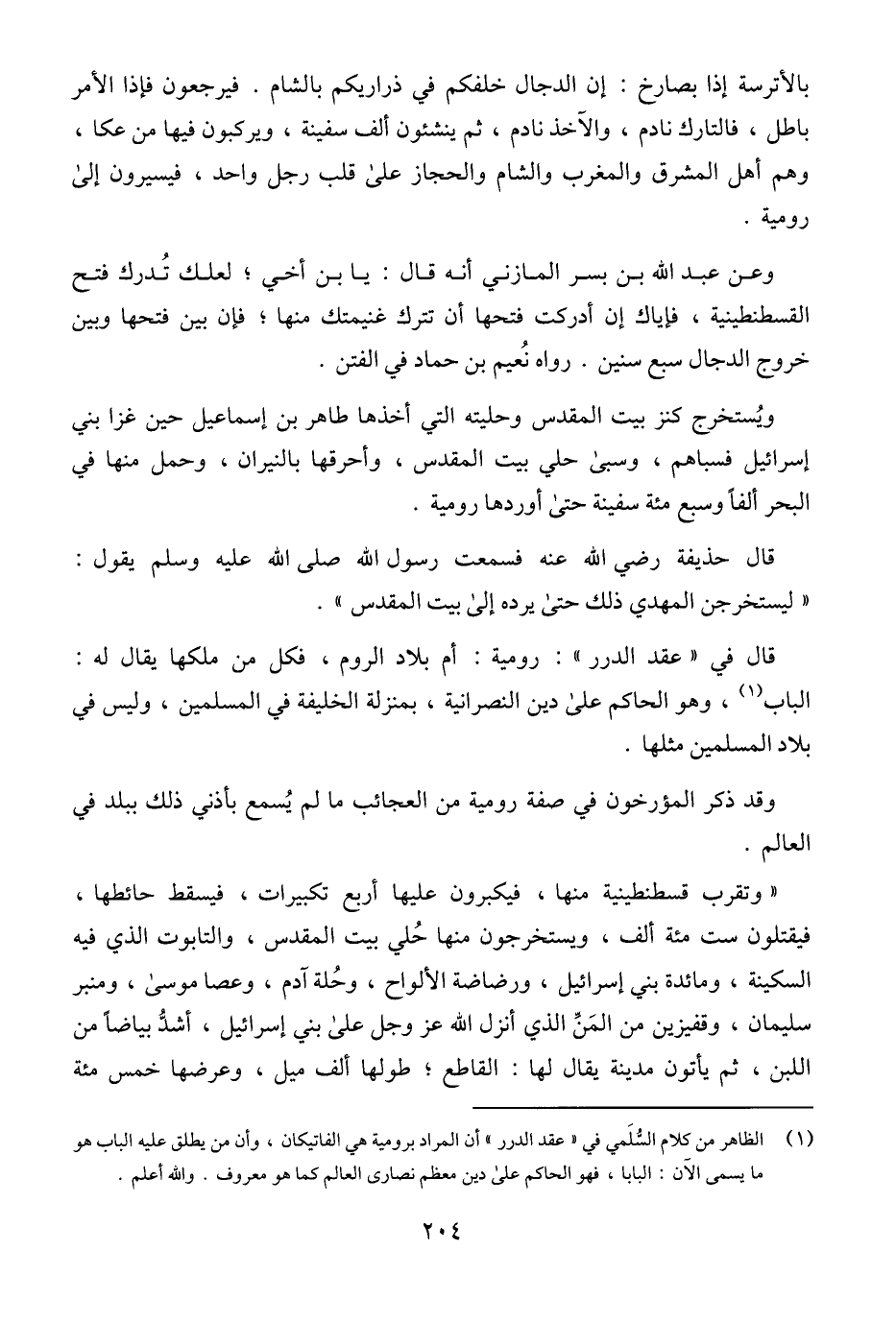 (¬1) الظاهر من كلام السُّلَمي في "عقد الدرر" أن المراد برومية هي الفاتيكان، وأن من يطلق عليه الباب هو ما يسمى الآن: البابا، فهو الحاكم على دين معظم نصارى العالم كما هو معروف. والله أعلم.