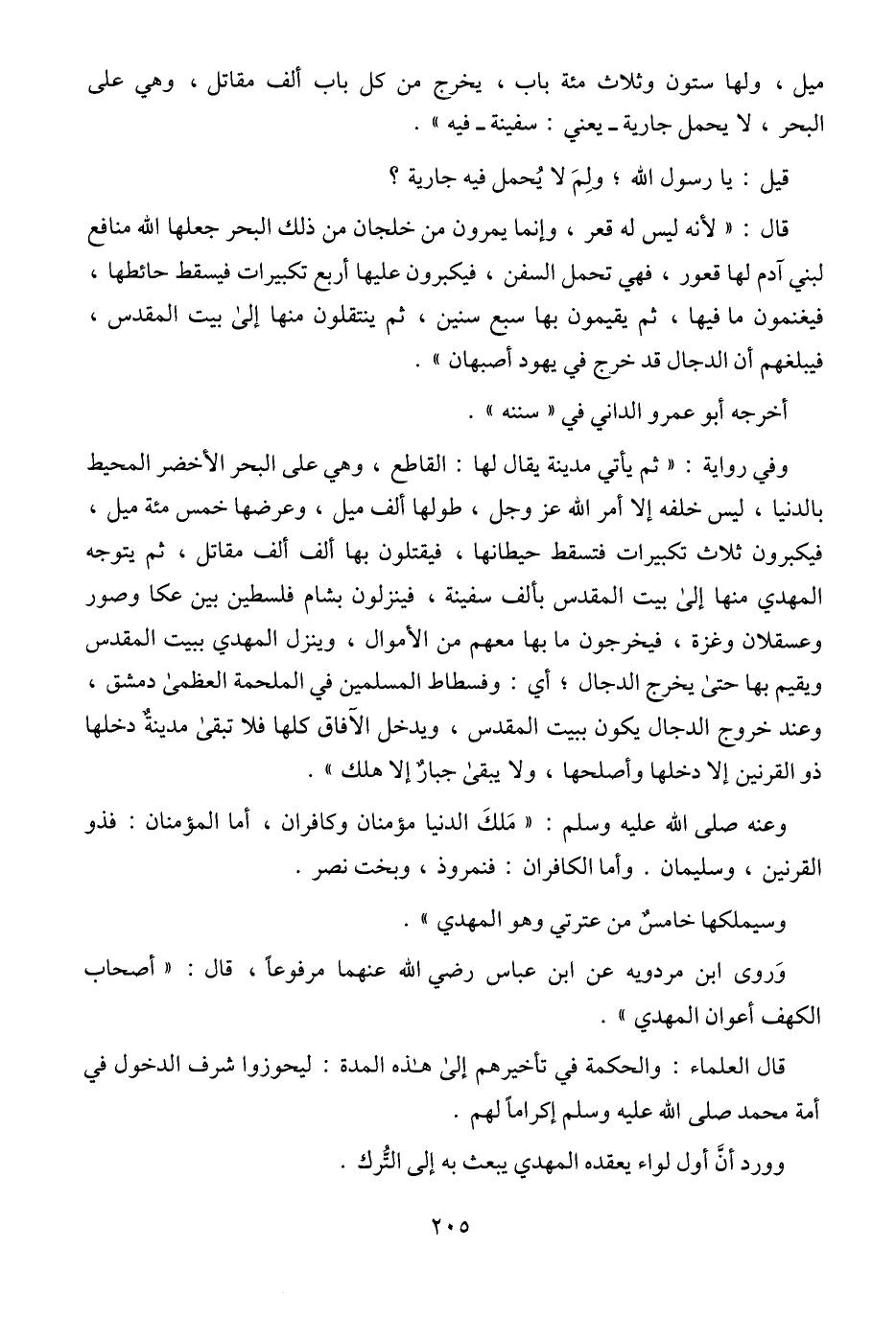 قال: "لأنه ليس له قعر، وإنما يمرون من خلجان من ذلك البحر جعلها الله منافع لبني آدم لها قعور، فهي تحمل السفن، فيكبرون عليها أربع تكبيرات فيسقط حائطها، فيغنمون ما فيها، ثم يقيمون بها سبع سنين، ثم ينتقلون منها إلى بيت المقدس، فيبلغهم أن الدجال قد خرج في يهود أصبهان".