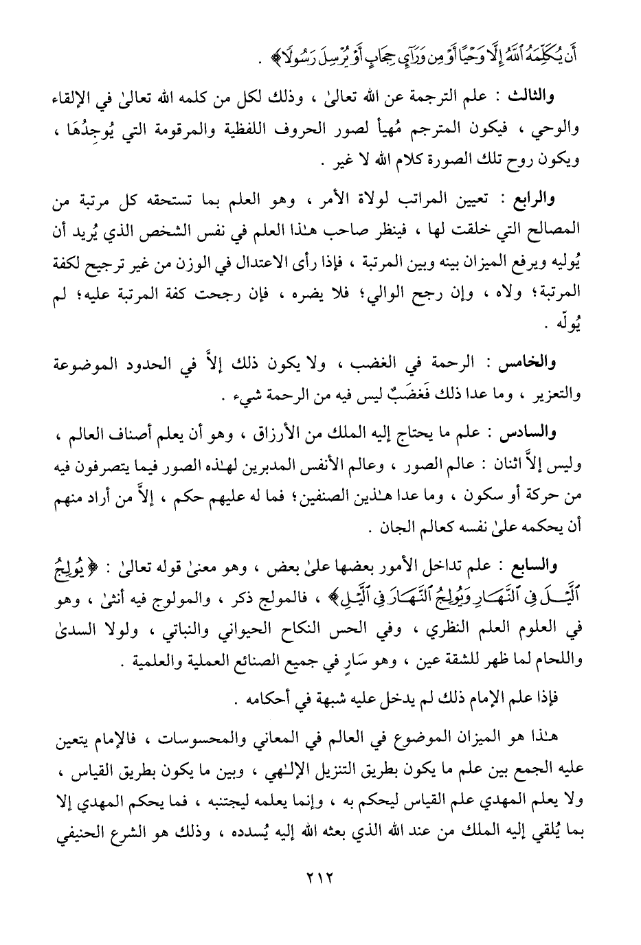 هذا هو الميزان الموضوع في العالم في المعاني والمحسوسات، فالإمام يتعين عليه الجمع بين علم ما يكون بطريق التنزيل الإلهي، وبين ما يكون بطريق القياس، ولا يعلم المهدي علم القياس ليحكم به، وإنما يعلمه ليجتنبه، فما يحكم المهدي إلَّا بما يُلقي إليه الملك من عند الله الذي بعثه الله إليه يُسدده، وذلك هو الشرع الحنيفي