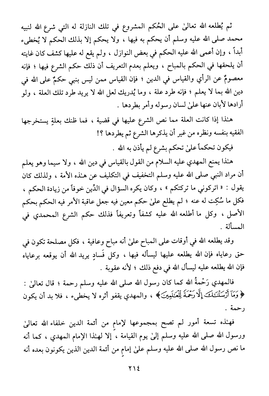 هذا يمنع المهدي عليه السلام من القول بالقياس في دين الله، ولاسيما وهو يعلم أن مراد النبي - صلى الله عليه وسلم - التخفيف في التكليف عن هذه الأمة، ولذلك كان يقول: "اتركوني ما تركتكم"، وكان يكره السؤال في الدِّين خوفًا من زيادة الحكم، فكل ما سُكِت له عنه؛ لم يطلع على حكم معين فيه جعل عاقبة الأمر فيه الحكم بحكم الأصل، وكل ما أطلعه الله عليه كشفًا وتعريفًا فذلك حكم الشرع المحمدي في المسألة.