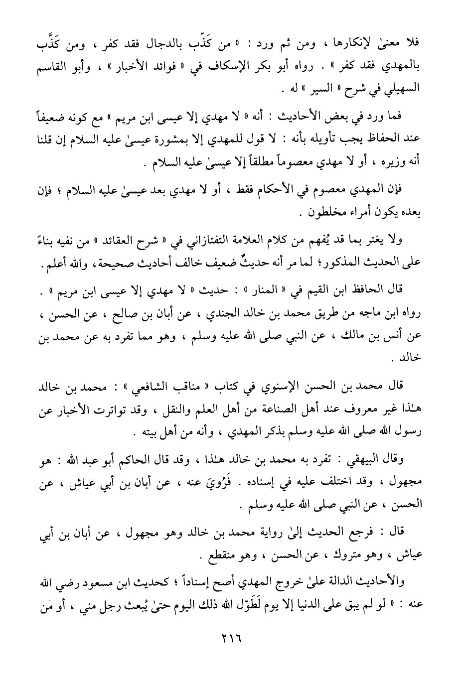 فلا معنى لإنكارها، ومن ثم ورد: "من كَذّب بالدجال فقد كفر، ومن كَذَّب بالمهدي فقد كفر". رواه أبو بكر الإسكاف في "فوائد الأخبار"، وأبو القاسم السهيلي في شرح "السير" له.