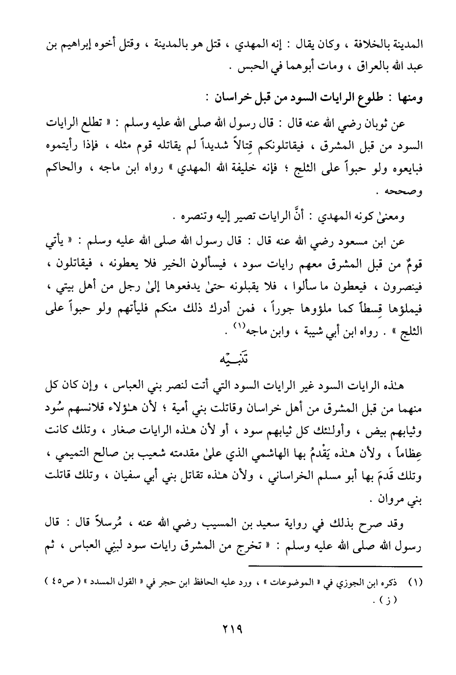 هذه الرايات السود غير الرايات السود التي أتت لنصر بني العباس، وإن كان كل منهما من قبل المشرق من أهل خراسان وقاتلت بني أمية؛ لأن هؤلاء قلانسهم سُود وثيابهم بيض، وأولئك كل ثيابهم سود، أو لأن هذه الرايات صغار، وتلك كانت عِظامًا، ولأن هذه يَقْدمُ بها الهاشمي الذي على مقدمته شعيب بن صالح التميمي، وتلك قَدمَ بها أبو مسلم الخراساني، ولأن هذه تقاتل بني أبي سفيان، وتلك قاتلت بني مروان.