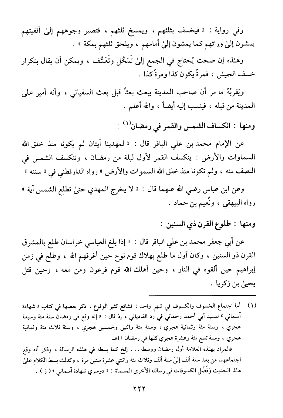 (¬1) أما اجتماع الخسوف والكسوف في شهرٍ واحد: فشائع كثير الوقوع، ذكر بعضها في كتاب "شهادة آسماني" للسيد أبي أحمد رحماني في رد القادياني، إذ قال: "إنه وقع في رمضان سنة مئة وسبعة هجري، وسنة مئة وثمانية هجري، وسنة مئة واثنين وخمسين هجري، وسنة ثلاث مئة وثمانية هجري، وسنة تسع مئة وعشرة هجري كلها في رمضان" اهـ